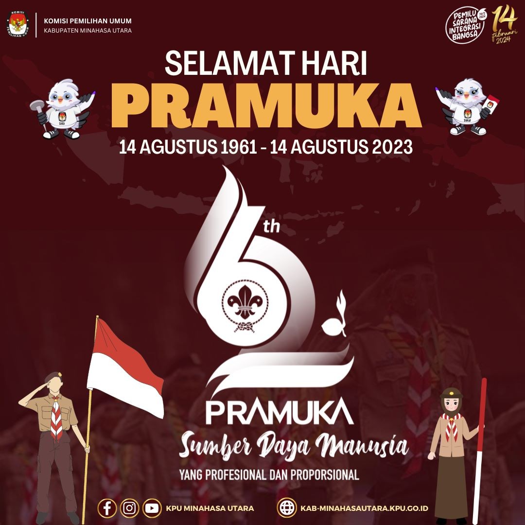 #TemanPemilih KPU Minahasa Utara mengucapkan Selamat merayakan Hari Pramuka 2023. Kedisiplinan dan kepedulian dalam menghadapi beragam rintangan adalah jiwa seorang Pramuka yang harus dilakukan dalam kehidupan sehari-hari. #KPUMelayani #PemiluSerentak2024