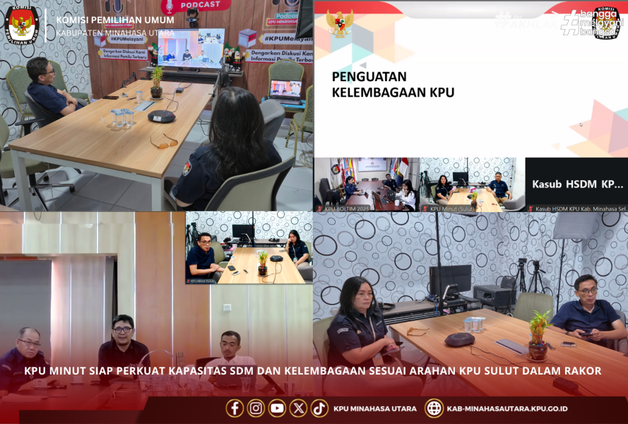 #TemanPemilih, Komisi Pemilihan Umum (KPU) Kabupaten Minahasa Utara menghadiri rapat koordinasi Penguatan Kapasitas SDM dan Kelembagaan yang diselenggarakan KPU Sulawesi Utara secara daring. Rapat dibuka oleh Ketua KPU Sulawesi Utara, Kenly M. Poluan, yang dalam arahannya menyampaikan pentingnya membangun sistem dan budaya kerja yang terbuka serta transparan di lingkungan KPU. “Legacy yang kita tinggalkan harus berupa sistem dan budaya kerja yang terbuka dan transparan. Setiap elemen dalam organisasi harus dilibatkan dalam proses perencanaan agar hasilnya lebih kuat dan berkelanjutan,” ujar Kenly. Sementara itu, Sekretaris KPU Sulawesi Utara, Meidy R. Malonda, dalam arahannya menyampaikan bahwa di era transformasi digital saat ini, setiap aparatur KPU dituntut untuk mampu beradaptasi dan memanfaatkan teknologi secara cerdas dalam mendukung pelaksanaan tugas dan fungsi kelembagaan. Menurutnya, SDM yang berkualitas dan kelembagaan yang kuat merupakan pondasi utama agar KPU memiliki daya saing dan kapasitas kelembagaan yang tangguh. Selanjutnya, Ketua Divisi Sosdiklih Parmas dan SDM KPU Sulut, Awaluddin Umbola, menegaskan pentingnya pembinaan dan penguatan kapasitas sumber daya manusia (SDM) di lingkungan KPU. Menurutnya, SDM merupakan faktor kunci yang harus dikelola dan dimaksimalkan secara baik agar roda kelembagaan dapat berjalan secara optimal. Ia juga mendorong agar pasca pelaksanaan tahapan pemilihan, KPU di tingkat kabupaten dan kota tetap aktif menyelenggarakan forum-forum diskusi internal sebagai sarana pembelajaran dan peningkatan kompetensi bagi jajaran penyelenggara. Lebih lanjut, Awaluddin menjelaskan bahwa tingkat partisipasi masyarakat tidak semata diukur dari banyaknya pemilih yang hadir di TPS, tetapi juga dari kualitas dan kesiapan SDM penyelenggara adhoc, seperti PPK, PPS, dan KPPS, yang akan bertugas dalam tahapan pemilu berikutnya. Hadir dalam rakor ini Ketua Divisi Sosdiklih Parmas dan SDM KPU Minut, Risky A. Pogaga, Sekretaris, Ariesto J. Matantu, Kasubag Hukum dan SDM, Jeane V. Mondoringin. #KPUmelayani ....