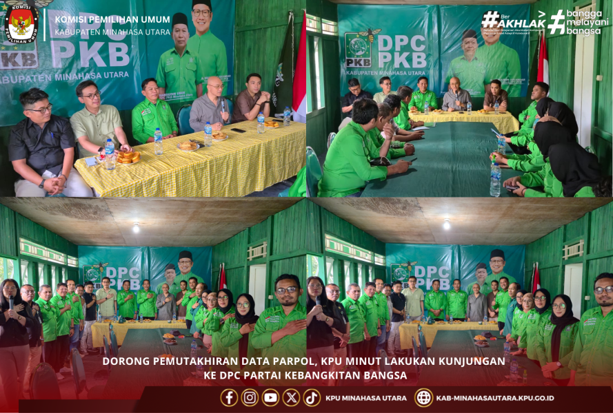 #TemanPemilih, KPU Kabupaten Minahasa Utara (KPU Minut) mengunjungi Sekretariat DPC Partai Kebangkitan Bangsa (PKB) Kabupaten Minahasa Utara, Rabu (15/10/2025), dalam rangka koordinasi pemutakhiran data Partai Politik berkelanjutan. Kunjungan tersebut dipimpin Ketua KPU Minut, Hendra S. Lumanauw bersama Anggota yaitu Ibnu M. Dali, Risky A.Pogaga, dan Hedriyanto K. Jacob. Adapun kehadiran KPU Minut disambut hangat oleh jajaran pengurus DPC Partai Kebangkitan Bangsa Minahasa Utara, yakni Ketua Samsudin Uber, Wakil Ketua Irvan Tutupo, Sekretaris Ardiansyah, Bendahara Rima Dali serta ikut didampingi Sekretaris Wilayah DPW PKB Sulut Sarhan Antili. Hendra S. Lumanauw, dalam sambutannya menyampaikan bahwa kunjungan ini merupakan bagian dari verifikasi terhadap partai politik. Ia mendorong partai politik untuk terus memperbarui data Kepengurusan, Keterwakilan Perempuan, Keanggotaan dan Domisili Kantor Tetap agar selalu termutakhirkan di Sistem Informasi Partai Politik (SIPOL). Turut mendampingi Sekretariat KPU Minut yaitu Kasubag Teknis, Partisipasi, dan Hubungan Masyarakat, Fikri Tjikoa. Diketahui, Pemutakhiran Data Partai Politik secara berkelanjutan meliputi : 1. Kepengurusan Partai Politik pada tingkat pusat, provinsi, kabupaten/kota, dan kecamatan; 2. Keterwakilan perempuan pada kepengurusan Partai Politik tingkat pusat, provinsi, dan kabupaten/kota; 3. Keanggotaan Partai Politik; dan 4. Domisili Kantor Tetap untuk kepengurusan Partai Politik pada tingkat pusat, provinsi, dan kabupaten/kota. #KPUmelayani #KPUMinahasaUtara ....