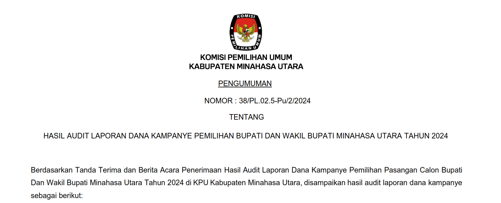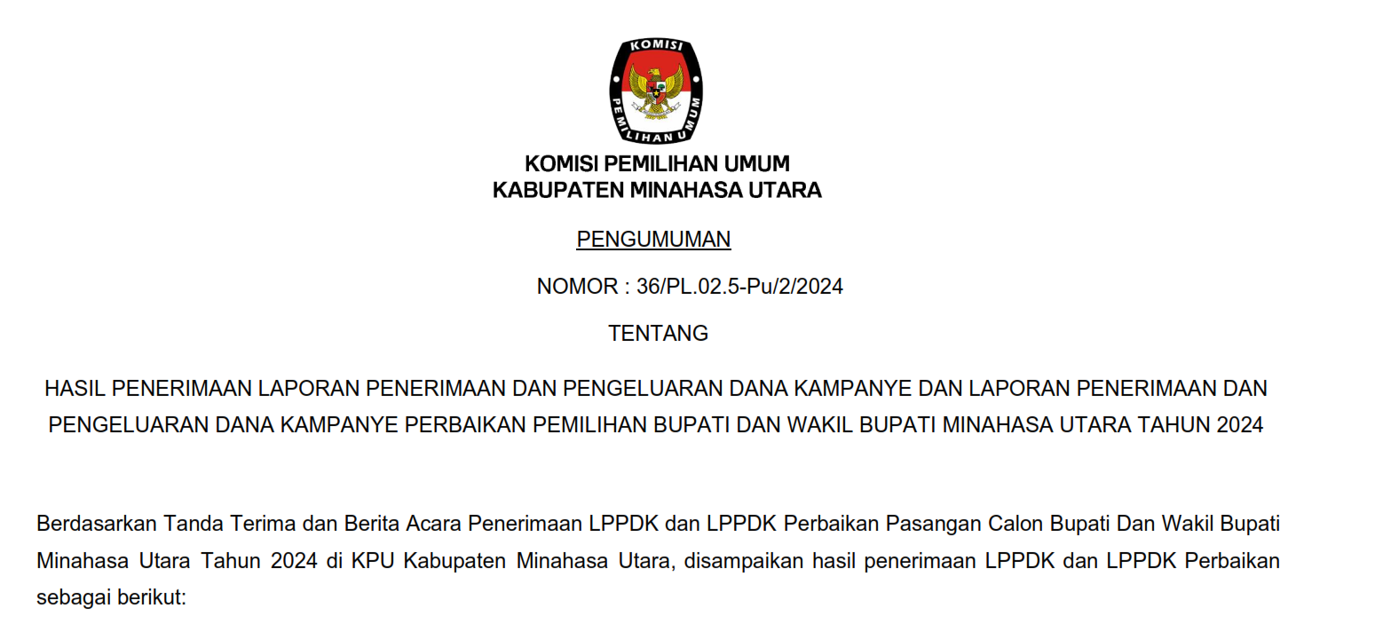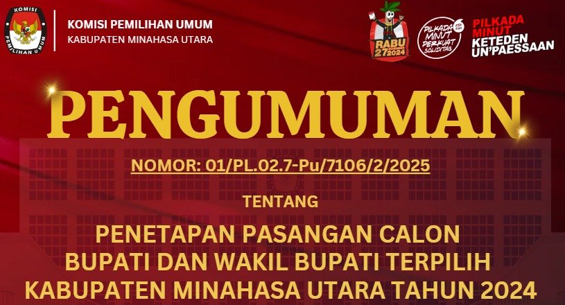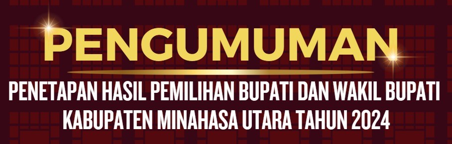 Berdasarkan Berita Acara dan Sertifikat Hasil Penghitungan Perolehan Suara Bupati dan Wakil Bupati di Tingkat Kabupaten/Kota dari Seluruh Wilayah Kecamatan Pemilihan Bupati dan Wakil Bupati Tahun 2024, Komisi Pemilihan Umum Kabupaten Minahasa Utara mengumumkan Keputusan Komisi Pemilihan Umum Kabupaten Minahasa Utara Nomor 1287 Tahun 2024 Tentang Penetapan Hasil Pemilihan Bupati dan Wakil Bupati Kabupaten Minahasa Utara Tahun 2024 yang dapat diunduh pada link berikut: KLIK DISINI Demikian pengumuman ini disampaikan untuk dapat diketahui masyarakat seluas-luasnya. PENGUMUMAN SELENGKAPNYA DAPAT DIUNDUH DISINI