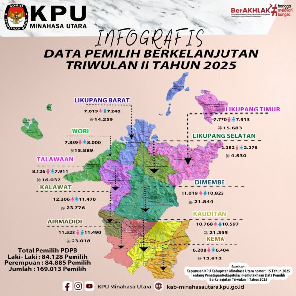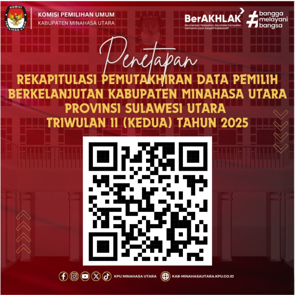 KPU Kabupaten Minahasa Utara telah menetapkan dan mengumumkan Rekapitulasi Data Pemilih Berkelanjutan (PDPB) Triwulan II Tahun 2025 melalui Berita Acara Nomor 28  Tahun 2025 tentang Rekapitulasi Daftar Pemilih Berkelanjutan (PDPB) Triwulan II (Kedua) TAhun 2025 dengan jumlah total pemilih aktif dalam PDPB sebanyak 169.013 (seratus enam puluh sembilan ribu tiga belas) pemilih yang tersebar di 10 (sepuluh) Kecamatan dan 131 Desa/Kelurahan dan Surat Keputusan Ketua KPU Kabupaten Minahasa Utara Nomor 15 Tahun 2025 tentang Penetapan Rekapitulasi Pemutakhiran Data Pemilih Berkelanjutan Kabupaten Minahasa Utara Provinsi Sulawesi Utara Triwulan II (Kedua) Tahun 2025. Untuk Berita Acara dan Surat Keputusan Ketua KPU Kabupaten Minahasa Utara dapat di download disini