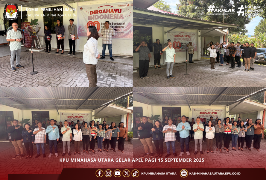 #TemanPemilih, KPU Kabupaten Minahasa Utara (KPU Minut), kembali menggelar Apel Pagi pada Senin (15/9/2025) yang dilaksanakan di halaman kantor KPU Minut. Pembina Apel pada kesempatan kali ini Ketua KPU Minahasa Utara, Hendra S. Lumanauw.