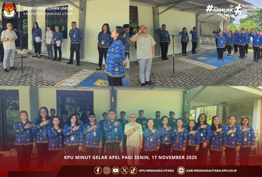 #TemanPemilih, Komisi Pemilihan Umum (KPU) Kabupaten Minahasa Utara melaksanakan apel pagi pada Senin (17/11/2025) yang berlangsung di halaman kantor KPU.