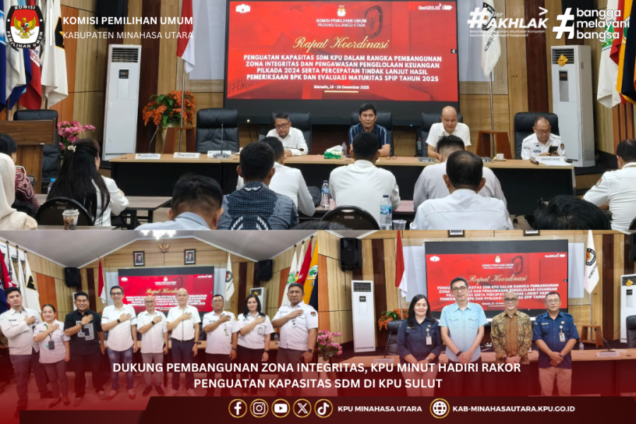 #TemanPemilih, Komisi Pemilihan Umum (KPU) Kabupaten Minahasa Utara menghadiri Rapat Koordinasi Penguatan Kapasitas Sumber Daya Manusia KPU dalam rangka pembangunan Zona Integritas, pengawasan pengelolaan keuangan Pilkada 2024, serta percepatan tindak lanjut hasil pemeriksaan Badan Pemeriksa Keuangan (BPK) dan evaluasi maturitas Sistem Pengendalian Intern Pemerintah (SPIP) Tahun 2025 yang berlangsung di Aula KPU Sulut selama dua hari, Senin-selasa (15-16/12/2025) yang diselenggarakan oleh KPU Provinsi Sulawesi Utara.