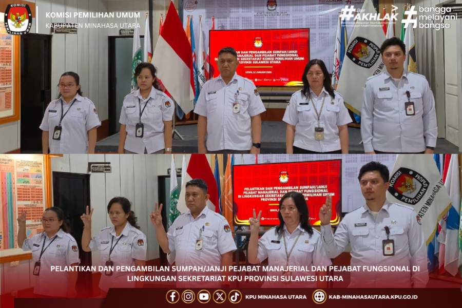 #TemanPemilih, Minahasa Utara - Sekretariat Komisi Pemilihan Umum (KPU) Kabupaten Minahasa Utara mengikuti kegiatan Pelantikan dan Pengambilan Sumpah/Janji Pejabat Manajerial dan Pejabat Fungsional yang diselenggarakan oleh Sekretariat KPU Provinsi Sulawesi Utara pada Senin, 12 Januari 2026.