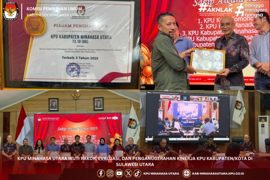 #TemanPemilih, Airmadidi — Komisi Pemilihan Umum (KPU) Kabupaten Minahasa Utara mengikuti kegiatan Rapat Koordinasi dan Evaluasi serta Penganugerahan Pengelolaan Jaringan Dokumentasi dan Informasi Hukum (JDIH), Penyelenggaraan Sistem Pengendalian Intern Pemerintah (SPIP) KPU Kabupaten/Kota Terbaik Tahun 2025, Anugerah Kepatuhan Pelaporan LHKPN Tahun 2024, serta SAKIP Award Tahun 2025, yang dilaksanakan di Kantor KPU Provinsi Sulawesi Utara pada Jumat, 23 Januari 2026.
