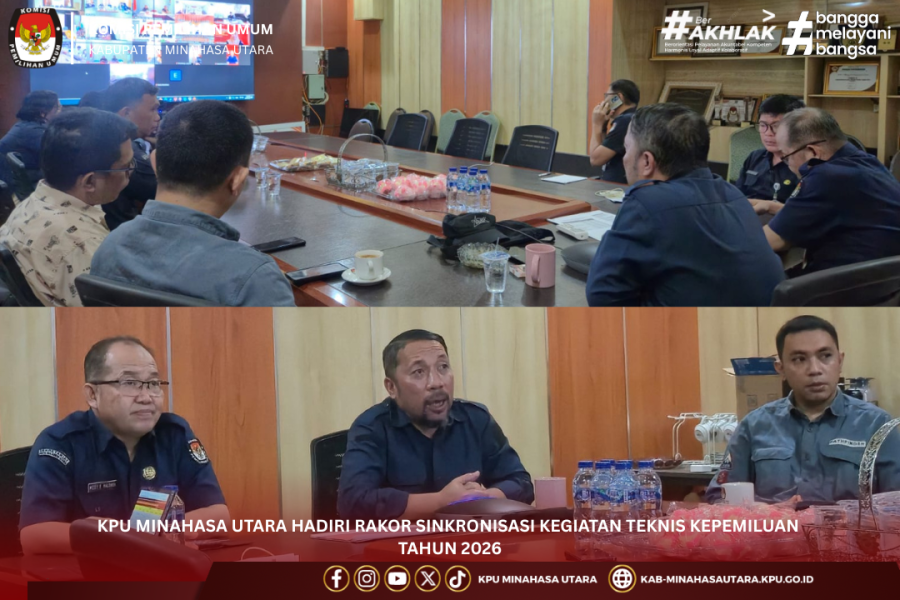 #TemanPemilih, Airmadidi - Komisi Pemilihan Umum (KPU) Kabupaten Minahasa Utara menghadiri Rapat Koordinasi (Rakor) Internalisasi Kebijakan dan Sinkronisasi Kegiatan Teknis Kepemiluan Tahun 2026 yang diselenggarakan oleh KPU Provinsi Sulawesi Utara, Selasa (10/2/2026).