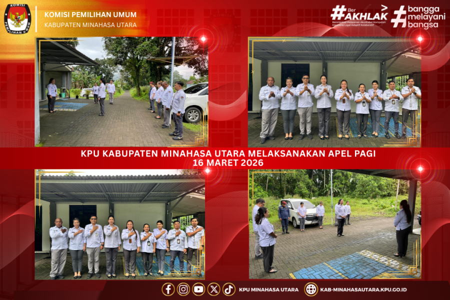 #TemanPemilih, Airmadidi - Komisi Pemilihan Umum Kabupaten Minahasa Utara (KPU Minut) melaksanakan apel pagi pada Senin (16/3/2026) di halaman Kantor KPU Minut. Apel pagi kali ini dipimpin oleh Sekretaris KPU Minut, Chylvia C. Sondakh selaku pembina apel. Sementara itu, bertindak sebagai Pemimpin Apel adalah Kasubag Teknis Penyelenggaraan Pemilu dan Hukum, Jessie Duinkerken.