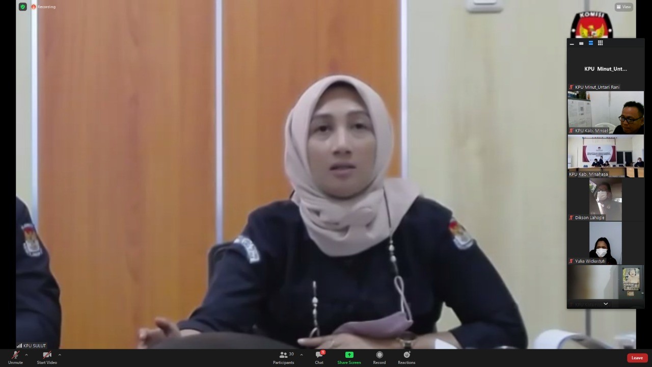 Selasa (25/01) Rapat Koordinasi Pemetaan TPS diselenggarakan secara Daring oleh KPU Provinsi Sulawesi Utara guna membahas pemutakhiran data pemilih berkelanjutan serta mengevaluasi kegiatan yang sudah dilaksanakan selama tahun 2021 yang dihadiri oleh 15 KPU Kabupaten/Kota yang terdiri dari Ketua Divisi Perencanaan, Data dan Informasi, Kasubbag Program dan Data serta Operator Sidalih. KPU Minut turut berpartisipasi dalam giat tersebut yang diwakili oleh Dikson Lahope selaku Kadiv Perencanaan, Data dan Informasi, Yulia Widiastuti selaku Kasubbag Program dan Data, serta Harry Lexi Waney dan Untari Rani selaku Operator Sidalih.