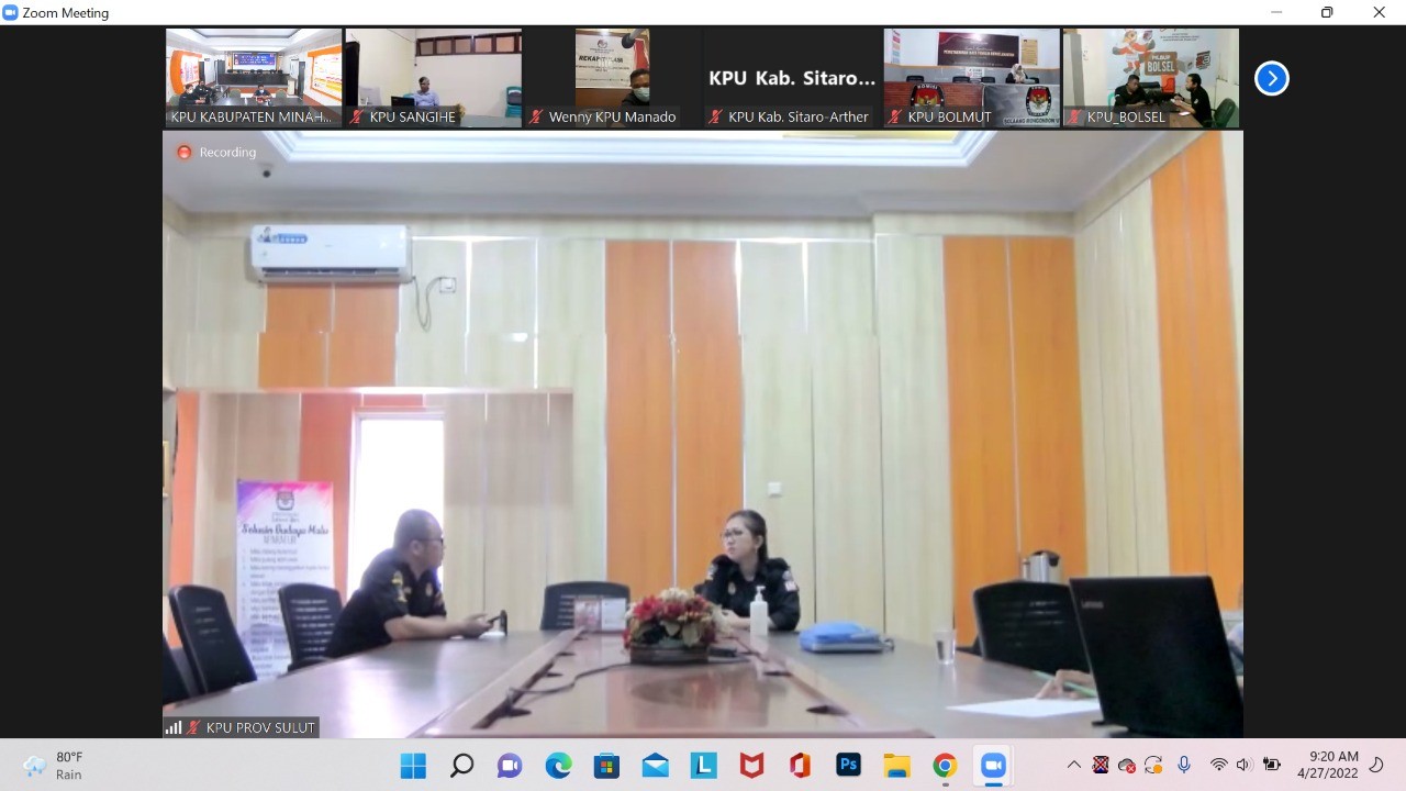 Rabu (27/04) Rapat Koordinasi Persiapan Rekapitulasi Daftar Pemilih Berkelanjutan periode April 2022 diselenggarakan secara Daring oleh KPU Provinsi Sulawesi Utara sesuai undangan nomor 138/TIK.04-Und/71/2022 tanggal 25 April 2022 guna membahas pemutakhiran data pemilih berkelanjutan. Agenda Rapat ini dihadiri oleh 15 KPU Kabupaten/Kota yang terdiri dari Ketua Divisi Perencanaan, Data dan Informasi, Kasubbag Program dan Data serta Operator Sidalih. KPU Minut turut berpartisipasi dalam giat tersebut yang diwakili oleh Dikson Lahope selaku Kadiv Perencanaan, Data dan Informasi, Yulia Widiastuti selaku Kasubbag Perencanaan Data dan Informasi, serta Harry Lexi Waney dan Untari Rani selaku Operator Sidalih.