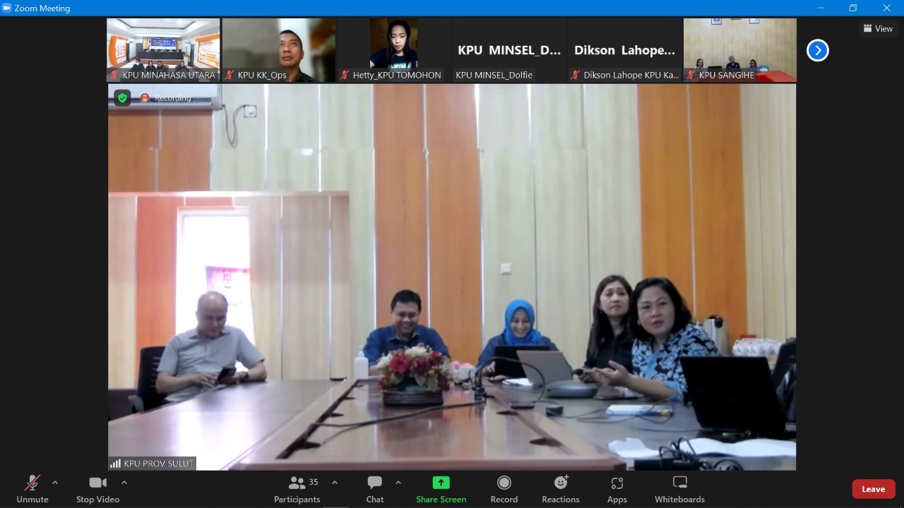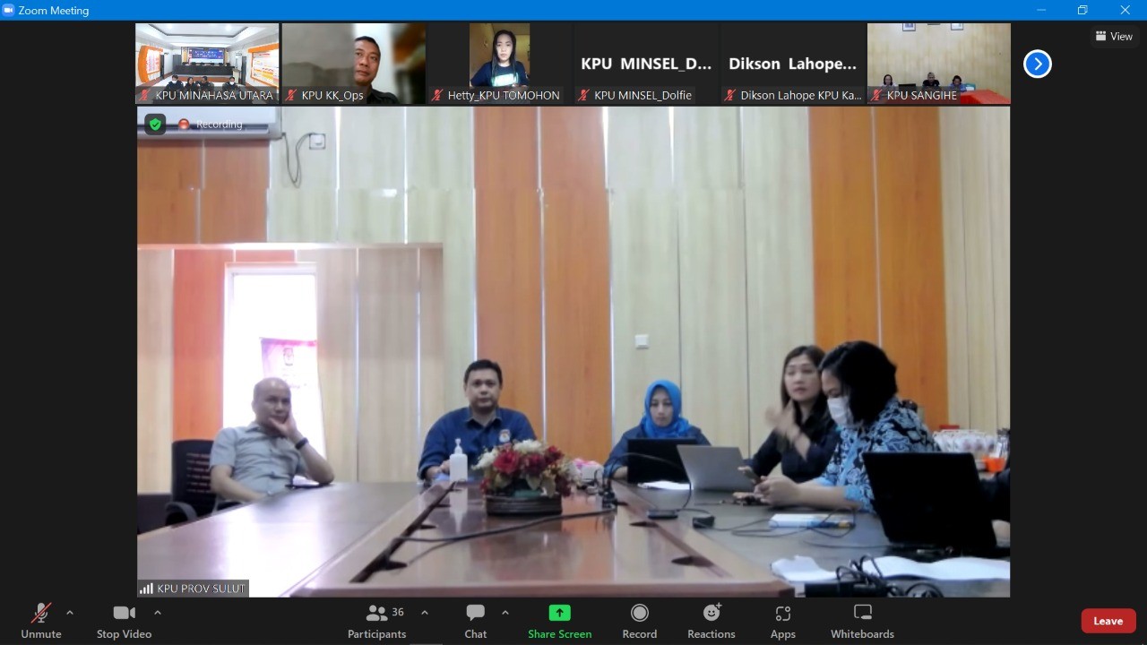 Selasa (05/07) Rapat Persiapan Rekapitulasi Daftar Pemilih Berkelanjutan (DPB) Periode Bulan Juni Tahun 2022 Tingkat Provinsi secara Daring oleh KPU Provinsi Sulawesi Utara guna membahas hasil Pemutakhiran Data Pemilih Berkelanjutan Bulan Juni yang sudah dilaksanakan oleh KPU Kabupaten/Kota yang dihadiri oleh 15 KPU Kabupaten/Kota yang terdiri dari Ketua Divisi Perencanaan, Data dan Informasi, Kasubbag Program dan Data serta Operator Sidalih. KPU Minut turut berpartisipasi dalam giat tersebut yang diwakili oleh Dikson Lahope selaku Kadiv Perencanaan, Data dan Informasi, Yulia Widiastuti selaku Kasubbag Perencanaan Data dan Informasi, serta Harry Lexi Waney dan Untari Rani selaku Operator Sidalih. “KPU Kabupaten/Kota harus melaksanakan PDPB sesuai peraturan yang berlaku dengan senantiasa berkoordinasi dengan instansi terkait.” tegas Ardiles Mewoh selaku Ketua KPU Provinsi Sulawesi Utara saat membuka rakor.