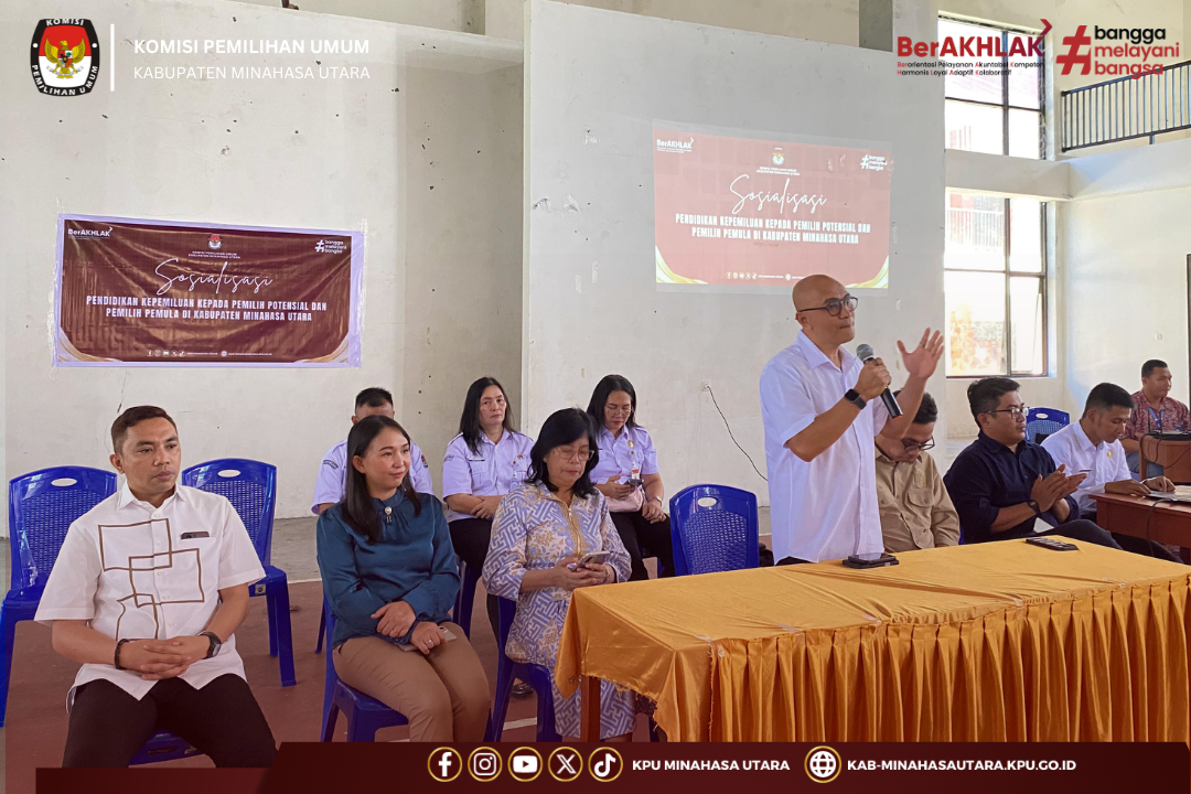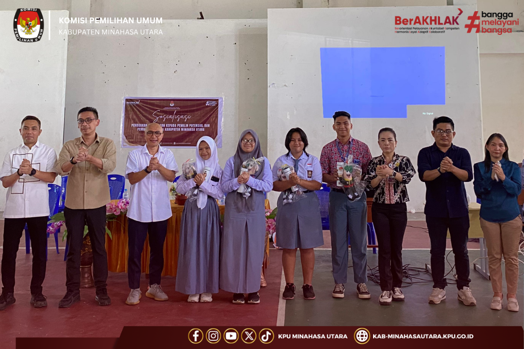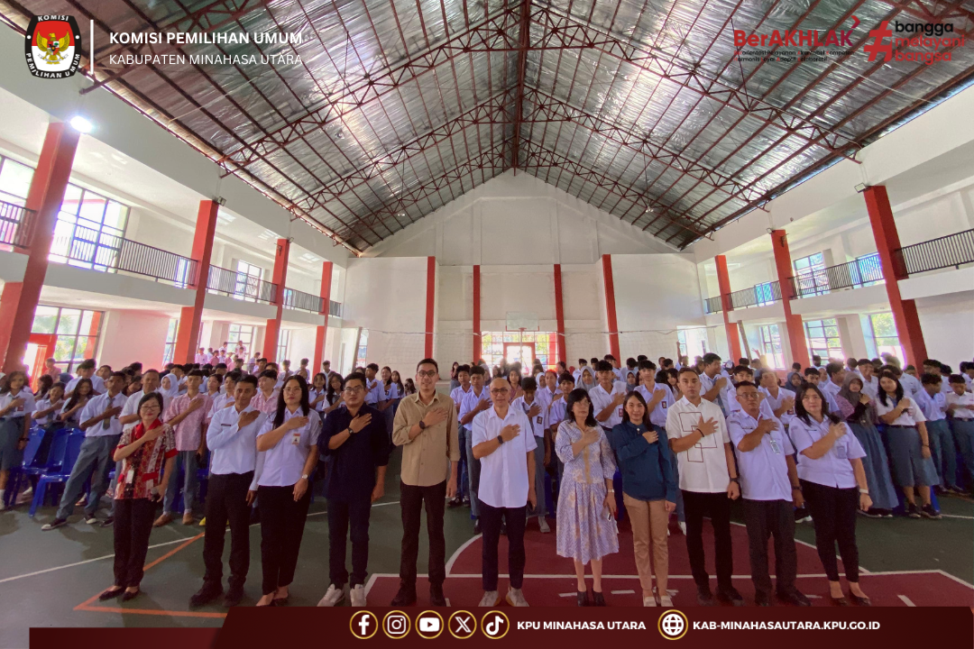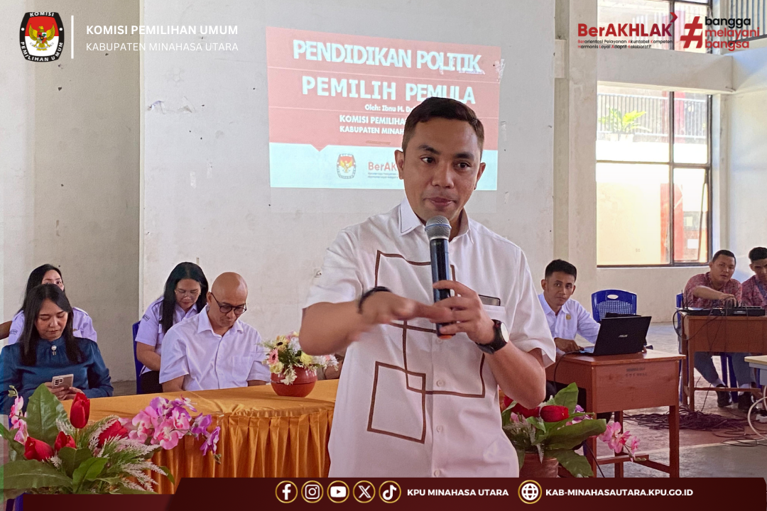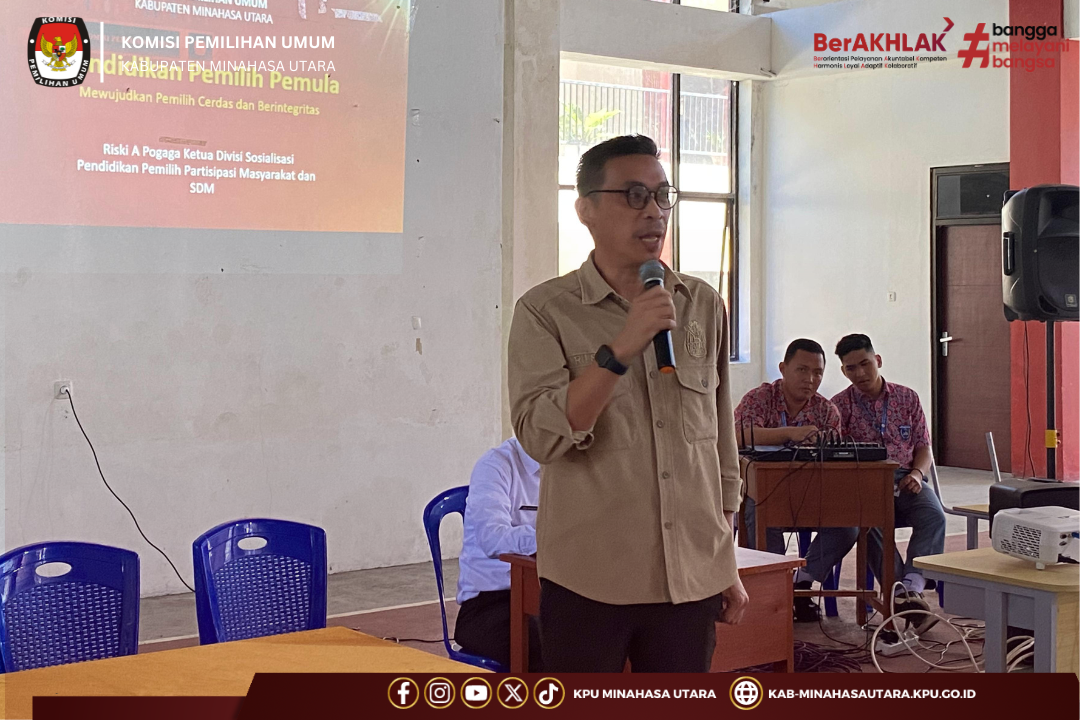 #TemanPemilih - Dalam rangka memperluas Pendidikan Kepemiluan bagi pemilih potensial pemilih pemula serta meningkatkan keikutsertaan para siswa di setiap proses Pemilu dan Pemilihan. KPU Minahasa Utara bekerjasama dengan Kepala Sekolah dan tenaga pengajar, menggelar kegiatan Sosialisasi Pendidikan Kepemiluan kepada siswa-siswi SMA Negeri 1 Guru Lombok di Kabupaten Minahasa Utara, Kamis (31/7/2025). Sosialisasi disampaikan oleh Ketua KPU Minahasa Utara Hendra S. Lumanauw, Kadiv Sosialisasi Pendidikan Pemilih, Partisipasi Masyarakat dan SDM Risky A. Pogaga, Kadiv Teknis Penyelenggaraan Ibnu M. Dali.