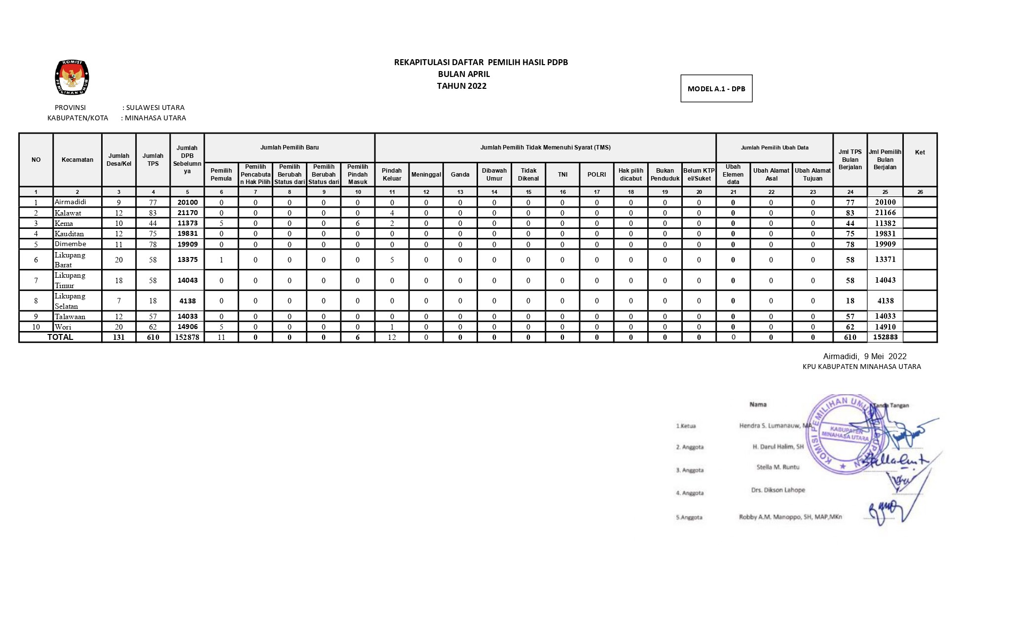 Rekapitulasi dan Infografis Data Pemilih Bulan April Tahun 2022 Kabupaten Minahasa Utara
