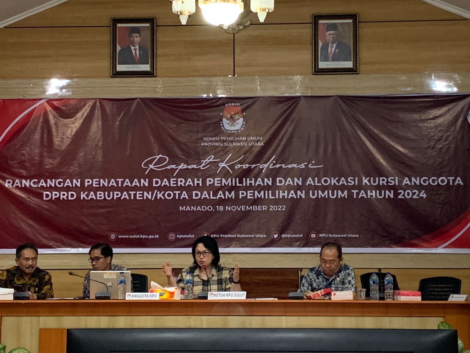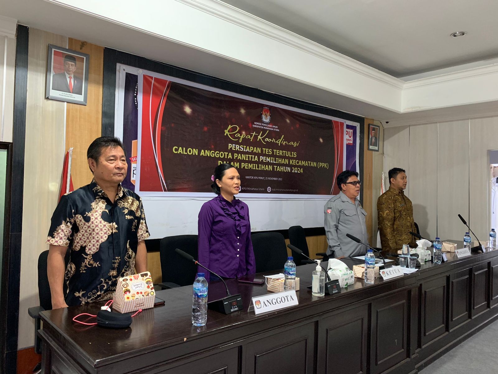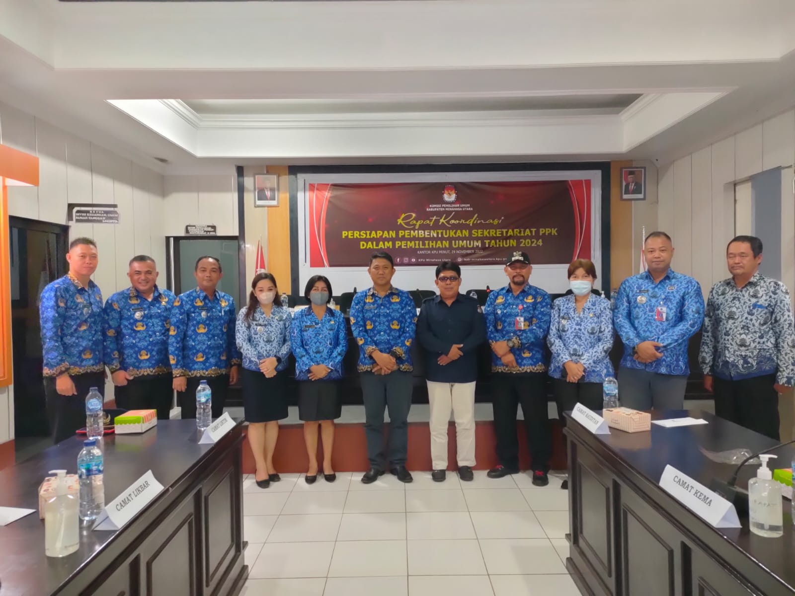Komisi Pemilihan Umum Kabupaten Minahasa Utara (KPU Minut) menggelar kegiatan Rapat Koordinasi persiapan pembentukan Sekretariat Panitia Pemilihan Kecamatan (PPK) dalam Pemilu Tahun 2024, Selasa (29/11), di ruang rapat KPU Kabupaten Minahasa Utara, Airmadidi. Adapun KPU Minut mengundang seluruh Camat se-Kabupaten Minahasa Utara. Rapat Koordinasi dibuka secara resmi oleh Ketua KPU Minut, Hendra S. Lumanauw, MA, didampingi Darul Halim, SH selaku Ketua Divisi Sosialisasi, Pendidikan Pemilih, Partisipasi Masyarakat, dan SDM, serta Sekretaris KPU Minut, Ariesto J. Matantu, SH, MH. Dalam sambutannya, Hendra Lumanauw menyampaikan maksud dan tujuan dalam rangka mewujudkan cita-cita bangsa untuk tercapainya Pemilu serentak tahun 2024 yang berkualitas dan demokratis. “Oleh sebab itu, langkah-langkah persiapan ini kami matangkan salah satunya yaitu rekerutmen Sekretariat PPK yang ada kaitannya erat dengan bapak/ibu kepala pemerintahan di 10 wilayah Kecamatan yang ada di Minahasa Utara,” ujar Hendra Lumanauw. Hendra Lumanauw mengapresiasi para Camat, ditengah kesibukan masih bisa menyempatkan hadir dalam Rapat Koordinasi ini. Sementara itu, Darul Halim menjelaskan penyelenggaraan Rapat Koordinasi ini dipandang sangat penting dan sangat perlu untuk dilaksanakan. “Rakor ini merupakan tindak lanjut dari koordinasi kami 4 hari lalu dengan Pemda Minut, diantaranya Kaban Kesbangpol, Kepala BKD, Diknas dan Dinkes,” ujarnya. Darul Halim menyampaikan bahwa Rakor ini juga untuk mengukur kesiapan di wilayah Kecamatan dalam rangka pembentukan Sekretariat PPK. Diharapkan, dengan diselenggarakan Rakor ini, pembentukan Sekretariat PPK nantinya dapat berjalan lancar tanpa ada kendala yang berarti.