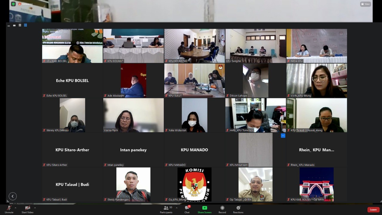 Selasa (25/01) Rapat Koordinasi Pemetaan TPS diselenggarakan secara Daring oleh KPU Provinsi Sulawesi Utara guna membahas pemutakhiran data pemilih berkelanjutan serta mengevaluasi kegiatan yang sudah dilaksanakan selama tahun 2021 yang dihadiri oleh 15 KPU Kabupaten/Kota yang terdiri dari Ketua Divisi Perencanaan, Data dan Informasi, Kasubbag Program dan Data serta Operator Sidalih. KPU Minut turut berpartisipasi dalam giat tersebut yang diwakili oleh Dikson Lahope selaku Kadiv Perencanaan, Data dan Informasi, Yulia Widiastuti selaku Kasubbag Program dan Data, serta Harry Lexi Waney dan Untari Rani selaku Operator Sidalih. “ KPU Kabupaten Kota harus melakukan pemetaan TPS sejak dini” tegas Lanny Ointu selaku Ketua Divisi Perencanaan Data dan Informasi KPU Provinsi Sulawesi Utara saat membuka rakor. “ “Dalam pemetaan TPS juga harus senantiasa memperhatikan aspek geografis dan juga dukungan terhadap pemilih disabilitas dalam penentuan titik koordinat TPS.” ucap Salman Saelangi selaku Ketua Divisi Sosdiklih Parmas dan SDM KPU Provisi Sulawesi Utara “Pemetaan TPS harus segera dilaksanakan oleh KPU Kabupaten Kota dengan memperhatikan PKPU Nomor 6 tahun 2021.” pungkas Ardiles Mewoh selaku Ketua KPU Provinsi Sulawesi Utara sambil menutup acara Rakor. Dalam rapat ini juga dihadiri oleh jajaran Sekretariat KPU Provinsi Sulawesi Utara yakni Kabag PDOS Winda Tulangow serta Kasubag Program dan Data Lani Alow.