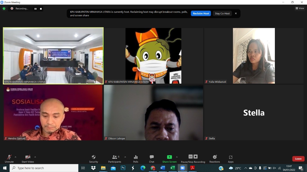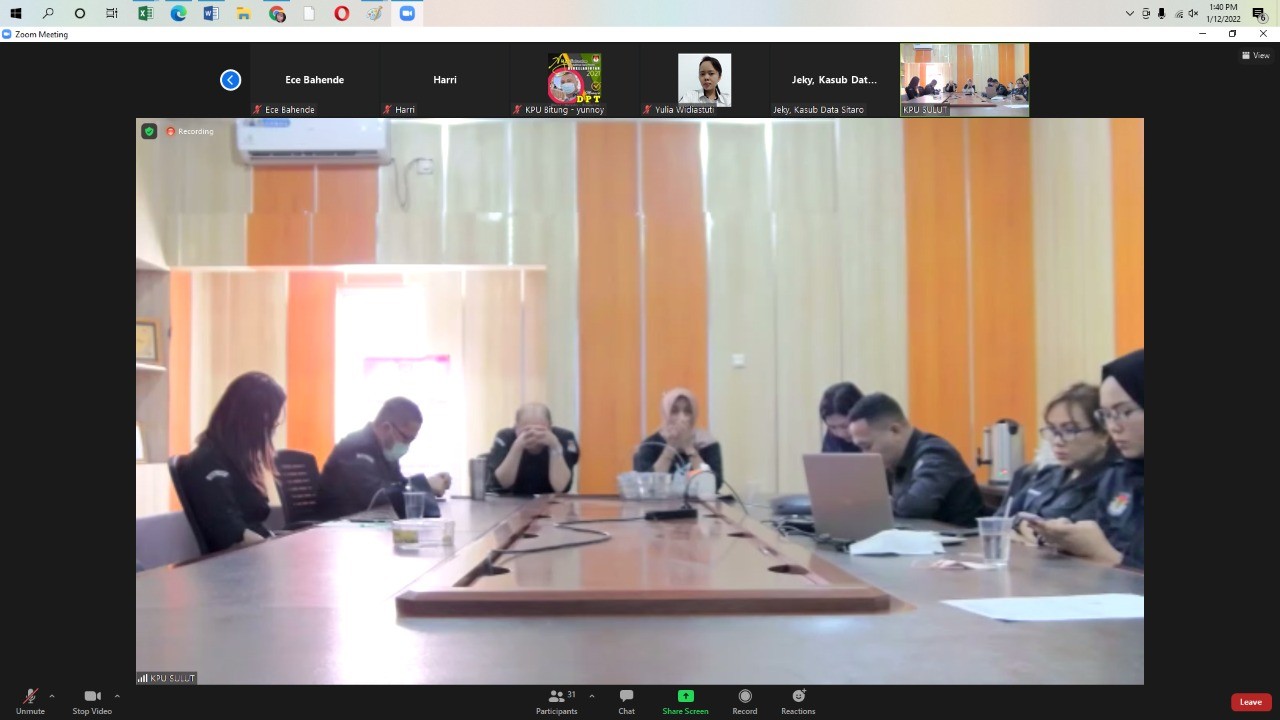 Rabu (12/01) Rapat terkait Pemutakhiran Data Pemilih Berkelanjutan dan Evaluasi Kegiatan Divisi Perencanaan Data dan Informasi yang diselenggarakan secara Daring oleh KPU Provinsi Sulawesi Utara guna membahas pemutakhiran data pemilih berkelanjutan serta mengevaluasi kegiatan yang sudah dilaksanakan selama tahun 2021 yang dihadiri oleh 15 KPU Kabupaten/Kota yang terdiri dari Ketua Divisi Perencanaan, Data dan Informasi, Kasubbag Program dan Data serta Operator Sidalih. KPU Minut turut berpartisipasi dalam giat tersebut yang diwakili oleh Dikson Lahope selaku Kadiv Perencanaan, Data dan Informasi, Yulia Widiastuti selaku Kasubbag Program dan Data, serta harry Lexi Waney dan Untari Rani selaku Operator Sidalih. “ Seluruh Komisioner dan Sekretariat KPU Kabupaten/Kota harus meningkatkan kinerja untuk mencapai target yang telah di tetapkan serta mempertahankan prestasi yang telah dicapai” tegas Lanny Ointu selaku Plh. Ketua KPU Provinsi Sulawesi Utara saat membuka rakor. “KPU kabupaten/ Kota harus menyajikan Grafik Pemutakhiran Data Pemilih di website dengan data informatif agar dapat memberi pemahaman yang baik kepada publik,” ucap Meydi Tinangon selaku Ketua Divisi Hukum dan Pengawasan KPU Provinsi Sulawesi Utara. “Kepala Sub Bagian Program dan Data harus memahami RKA-KL serta melakukan pencermatan sehingga dapat mengantisipasi terjadinya kekurangan anggaran yang dapat menghambat pelaksanaan kegiatan.” ujar Salman Saelangi selaku Ketua Divisi Sosialisasi Pendidikan Pemilih Partisipasi Masyarakat dan Sumber Daya Manusia KPU Provinsi Sulawesi Utara Dalam rapat ini juga dihadiri oleh jajaran Sekretariat KPU Provinsi Sulawesi Utara yakni Kabag PDOS Winda Tulangow serta Kasubag Program dan Data Lani Alow.
