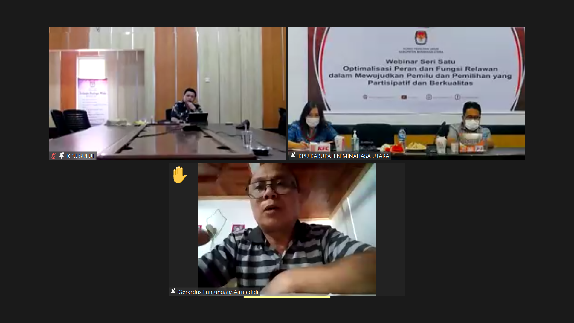 Jumat (10/12), KPU Kabupaten Minahasa Utara (KPU Minut) melaksanakan Webinar Seri 1 Optimalisasi Peran Dan Fungsi Relawan Dalam Mewujudkan Pemilu Dan Pemilihan Yang Partisipatif Dan Berkualitas. Webinar dilaksanakan secara daring melalui Zoom Meeting. Webinar dibuka oleh Ketua KPU Minut Hendra Lumanauw yang menyampaikan bahwa dilaksanakannya webinar ini ditujukan sebagai upaya mendorong masyarakat menjadi pemilih yang mandiri, cerdas, dan bertanggung jawab sehingga tumbuh kesadaran dalam bernegara serta mendorong masyarakat untuk berpartisipasi pada pemilu dan pemilihan. Webinar diisi dengan Narasumber Ardiles Mewoh Ketua KPU Provinsi Sulawesi Utara dan Salman Saelangi Anggota KPU Provinsi Sulawesi Utara. Moderator webinar yakni Jeane Mondoringin Kasubbag Teknis dan Hupmas KPU Minut. Peserta webinar ialah relawan dari 6 desa yang sebelumnya telah dilakukan sosialisasi secara luring oleh KPU Minut. Diharapakan dengan dilaksanakannya webinar ini maka masyarakat dan relawan sadar akan pentingnya peran mereka dalam mensukseskan suatu penyelenggaran pemilu dan pemilihan.