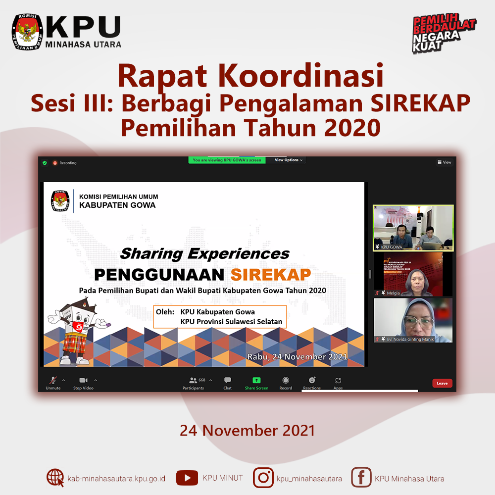 Sebagai tindak lanjut PKPU 6 Tahun 2021 dan SE KPU RI Nomor 366 Tahun 2021 tanggal 21 April 2021, perubahan atas SE KPU RI No.132 Tanggal 4 Februari 2021 yaitu perihal PDPB pasca Pemilihan Serentak Lanjutan 9 Desember 2020, sesuai Undang-Undang Nomor 7 Tahun 2017 tentang Pemilu pada Pasal 20 Ayat (1) dimana KPU Kab/Kota melaksanakan pemutakhiran dan memelihara data pemilih berkelanjutan sesuai dengan perundang-undangan yang berlaku KPU Kabupaten Minahasa Utara (KPU Minut) menggelar Rapat Koordinasi Daftar Pemilih Berkelanjutan pada Selasa (30/11). Dalam rapat ini hadir Ketua dan Anggota KPU Minut, Hendra Lumanauw, Dikson Lahope, Robby Manoppo, dan Darul Halim. Rapat ini juga mengundang pimpinan Bawaslu Kabupaten Minahasa Utara (Bawaslu Minut) yang dihadiri oleh Rocky Ambar serta Kepala Dinas Kependudukan dan Pencatatan Sipil Kabupaten Minahasa Utara yang diwakili oleh Kepala Seksi Sistem Informasi Administrasi Kependudukan Jolly Tuwaidan. “Kita bersyukur kepada Tuhan Yang Maha Esa, ditengah pandemic Covid 19 KPU Minahasa Utara dapat melaksanakan Rapat koordinasi pemutakhiran data pemilih berkelanjutan Bulan November Tahun 2021 untuk mempersiapkan Pemilu Serentak Tahun 2024. ucap Hendra Lumanauw selaku Ketua KPU Minahasa Utara saat membuka rapat. “KPU Minahasa Utara senantiasa bekerjasama dengan stakeholder untuk meningkatkan kualitas pemutakhiran data pemilih.” tutur Darul Halim selaku Ketua Divisi Sosdiklih Parmas KPU Minahasa Utara “Bawaslu Minahasa Utara mendukung kinerja KPU Minahasa Utara dalam memutakhirkan data pemilih berkelanjutan dan mengusulkan agar KPU Minahasa Utara senantiasa berkoordinasi dengan stakeholder terkait untuk mengupdate data pemilih.” ujar Rocky Ambar selaku Koordinator Divisi Hukum, Penanganan Pelanggaran dan Penyelesaian Sengketa Bawaslu Minahasa Utara “Dinas Dukcapil Minahasa Utara telah turun lapangan untuk merekam pemilih yang belum merekam KTP el.” Demikian penjelasan Kepala Seksi Sistem Informasi Administrasi Kependudukan Jolly Tuwaidan. Hingga periode November 2021, terdapat beberapa perubahan data pemilih berdasarkan yang telah direkapitulasi. Hal ini disampaikan oleh Kadiv Perencanaan, Data dan Informasi, Dikson Lahope. Dalam penyampaian data tersebut Rekapitulasi Data Pemilih Berkelanjutan KPU Minut terdapat Pemilih Pemula 32 (tiga puluh dua), Pemilih Pindah Masuk 99 (sembilan puluh sembilan), Pemilih Keluar 91 (sembilan puluh satu), Meninggal 158 (seratus lima puluh delapan), Bukan penduduk 36 (tiga puluh enam), Ubah Elemen Data 75 (tujuh puluh lima) sehingga total pemilih 152.686 (seratus lima puluh dua ribu enam ratus delapan puluh enam) dan data ini akan selalu dimutakhirkan agar data pemilih nantinya menjadi semakin berkualitas.