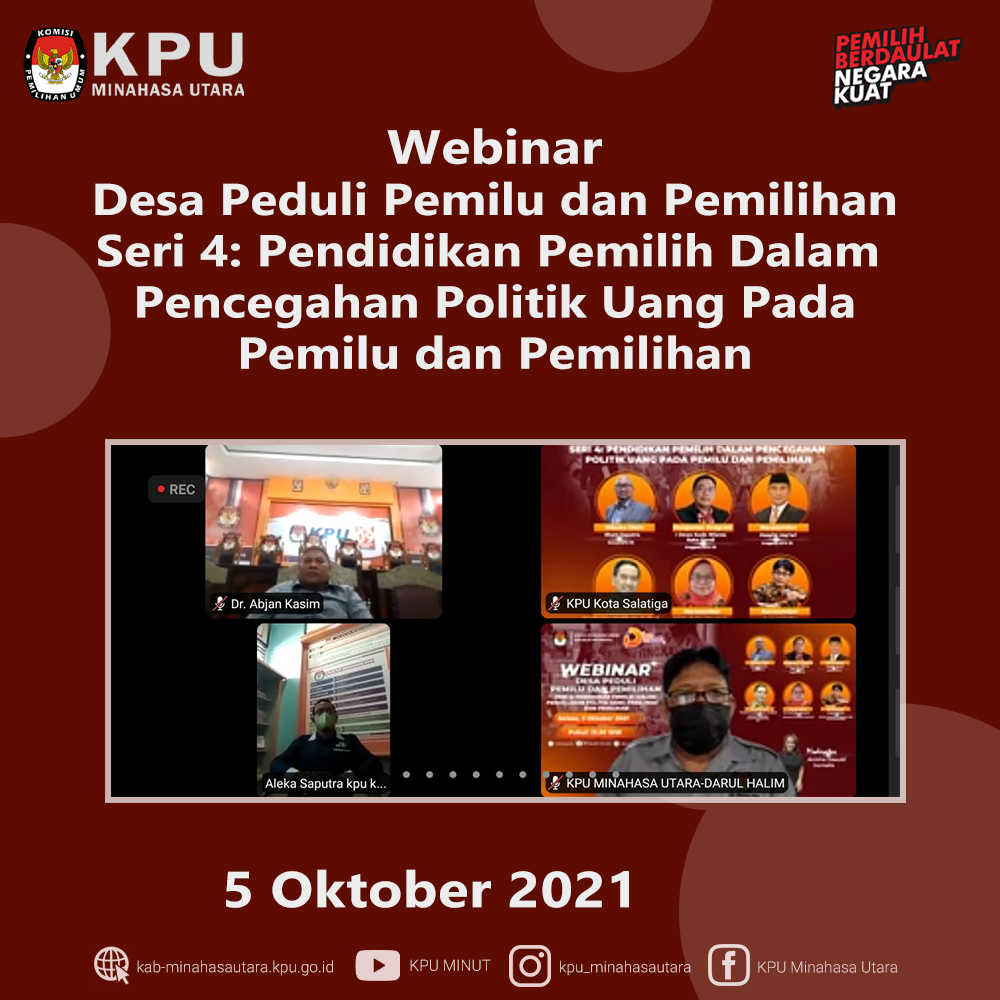 Selasa (5/10) KPU Kabupaten Minahasa Utara (KPU Minut) kembali ikuti Webinar Desa Peduli Pemilu Dan Pemilihan (DP3) Seri 4: Pendidikan Pemilih dalam Pencegahan Politik Uang pada Pemilu dan Pemilihan yang dilaksanakan oleh KPU Republik Indonesia (KPU RI) melalui Zoom Meeting dan kanal Youtube KPU RI. Webinar seri 4 ini diikuti oleh Ketua Divisi Sosdiklih Parmas dan SDM Darul Halim serta Kasubbag Teknis dan Hupmas Jeane Mondoringin.