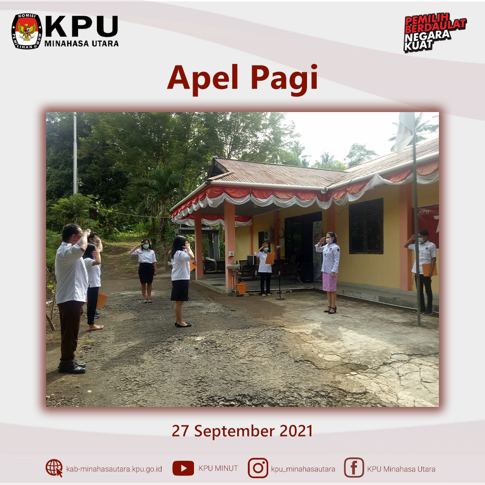KPU Kabupaten Minahasa Utara (KPU Minut) menggelar Apel Pagi pada Senin (27/9) di halaman KPU Minut. Pembina Apel pada kesempatan ini adalah Ketua Teknis Penyelenggaraan, Stella Runtu. Dalam gelaran apel ini, Stella mengapresiasi kedisiplinan dan kinerja sekretariat yang telah berjalan. “Teman-teman sekretariat sudah menjalankan kedisiplinan dengan sangat baik, terlihat dari tertibnya pelaksanaan WFH dan WFO serta jam kerja”. Stella menambahkan, disiplin, integritas, dan netralitas perlu dipertahankan sebagai instansi yang independen menyelenggarakan pemilu dan pemilihan. Stella juga menyinggung soal status level pemberlakuan pembatasan kegiatan masyarakat dalam rangka pencegahan penyebaran virus Covid-19 yang sudah turun menjadi level 2 di Kabupaten Minahasa Utara. Diharapkan protokol kesehatan tetap dilaksanakan secara tertib. “Tetap mencuci tangan dan mengenakan masker saat beraktivitas di kantor KPU, agar semua aman dan nyaman”, lanjut Kadiv Teknis Penyelenggaraan ini. Dengan menurunnya level PPKM ini, selanjutnya KPU Minut akan memberlakukan penyesuaian terhadap pelaksanaan kegiatan perkantoran.