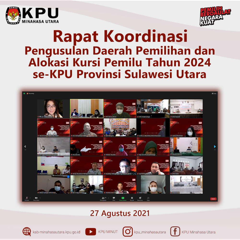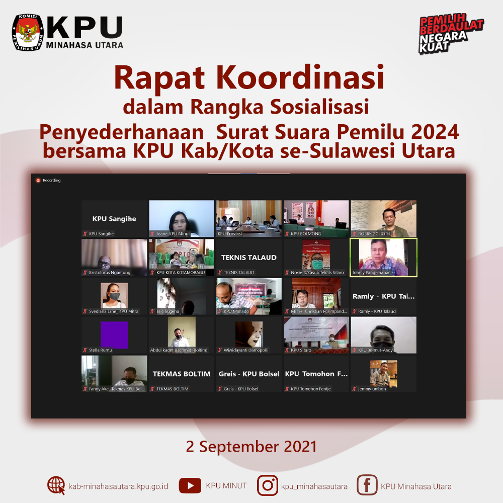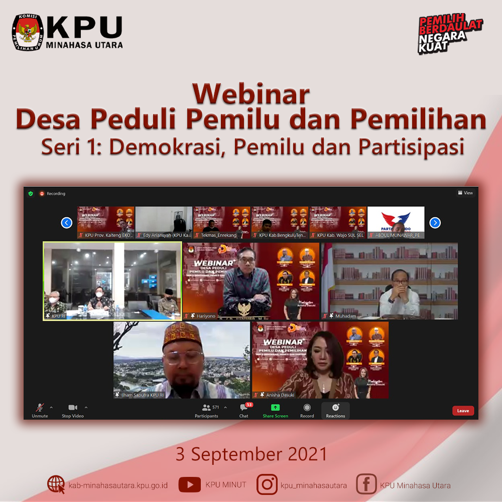 Jumat (3/9) KPU Minahasa Utara (KPU Minut) ikuti Webinar Desa Peduli Pemilu dan Pemilihan (DP3) Seri 1: Demokrasi, Pemilu dan Partisipasi yang dilaksanakan oleh KPU Republik Indonesia (KPU RI) melalui aplikasi Zoom Meeting dan kanal Youtube KPU RI. Acara webinar ini diikuti oleh H. Darul Halim, S.H., Ketua Divisi Sosialisasi, Pendidikan Pemilih, Partisipasi Masyarakat dan SDM KPU Minut, dan Jeane Mondoringin, Kasubag Teknis dan Hupmas KPU Minut. Acara Webinar dibuka oleh Ilham Saputra, Ketua KPU RI, yang menyampaikan bahwa program DP3 ini menjadi media berbagi ilmu bagi penyelenggara pemilu/pemilihan untuk dapat mempersiapkan masyarakat sebagai pemilih paham bagaimana berdemokrasi dan kritis dalam berdemokrasi sehingga nantinya dapat berpartisipasi secara aktif dalam penyelenggaraan pemilu/pemilihan tahun 2024. Yang menjadi narasumber dalam webinar adalah Hariyono, Wakil Kepala Badan Pembinaan Ideologi Pancasila yang membawakan materi dengan sub tema “Implementasi Demokrasi Pancasila Konteks Masyarakat Desa Di Era Digital” dan Muhadam Labolo, Dekan Fakultas Politik Pemerintahan Institut Pemerintahan Dalam Negeri, yang membawakan materi dengan sub tema “Partisipasi Masyarakat Desa Dalam Pemilu Dan Pemilihan Untuk Menwujudkan Demokrasi Substansial Di Indonesia”. Acara dipandu oleh Moderator, Anisha Dasuki. Serta yang menjadi Pengantar Program ialah I Dewa Kade Wiarsa Raka Sandi, Anggota KPU RI.