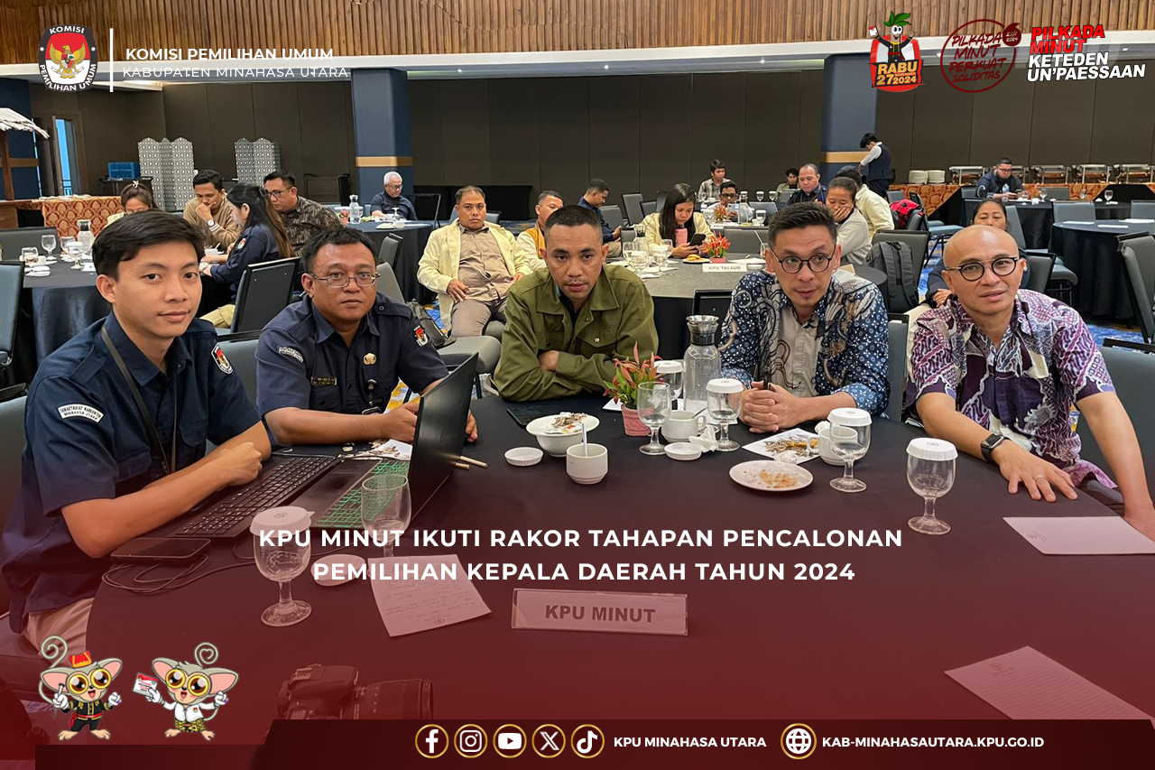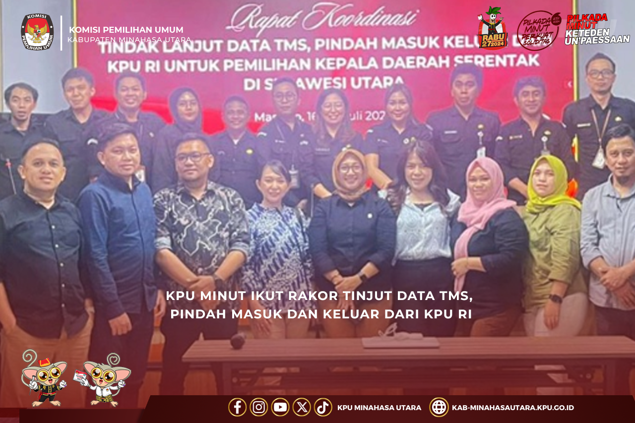 KPU Minahasa Utara mengikuti Rakor Tinjut Data TMS, Pindah Masuk dan Keluar dari KPU RI di Aula Kantor KPU Provinsi Sulawesi Utara, Selasa (16/7/2024). Hadir dalam rakor Ketua Divisi Perencanaan Data dan Informasi Minut Ireine Buyung dan Admin Sidalih Untary A. Rani. “Rapat koordinasi ini bertujuan untuk memastikan kelancaran dan akurasi data pemilih terkait pindah masuk dan pindah keluar antar KPU kabupaten/kota di Sulawesi Utara.” Tegas Lanny saat membuka acara. "Kami perlu memastikan bahwa data TMS seperti pindah masuk dan pindah keluar pemilih di Sulawesi Utara tercatat dengan benar dan akurat. Hal ini penting untuk menjamin hak pilih warga dan keabsahan hasil pemilihan kepala daerah serentak nanti," ujar Lanny dalam arahannya. Seluruh peserta rakor aktif berkontribusi dalam diskusi dan memberikan masukan yang konstruktif guna menyempurnakan persiapan menjelang Pemilihan Kepala Daerah Serentak di Sulawesi Utara pada tahun ini. Rapat diakhiri dengan komitmen untuk terus mengoptimalkan koordinasi dan kolaborasi antar KPU Kabupaten/Kota, guna mencapai tujuan bersama dalam menghadirkan pemilihan yang demokratis dan bermartabat.