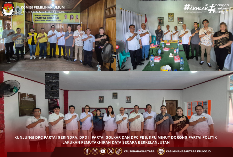 #TemanPemilih - KPU Kabupaten Minahasa Utara (KPU Minut) mengunjungi Sekretariat DPC Partai Gerindra, DPD II Partai Golkar dan DPC PBB Kabupaten Minahasa Utara, Jumat (26/9/2025), dalam rangka koordinasi pemutakhiran data Partai Politik secara berkelanjutan. Kunjungan tersebut dipimpin langsung Ketua KPU Minut, Hendra S. Lumanauw bersama Anggota yaitu Ibnu M. Dali, Risky A.Pogaga, dan Ireine Buyung. Adapun kehadiran KPU Minut disambut hangat oleh jajaran pengurus DPC Partai Gerindra Minahasa Utara, yakni Ketua Cynthia Imelda Erkles, S.A.B., Sekretaris Fiky Edwin Pungus, Bendahara Pretty Melizza Meidy Tuerah, Wakil Ketua Bernadus Togas. Selain DPC Partai Gerindra, jajaran KPU Minut juga melakukan kunjungan ke DPD II Partai Golkar Minahasa Utara yang disambut langsung oleh Ketua Edwin Maurits Nelwan, SP bersama Sekretaris Olivia Mantiri. Sementara itu dalam kunjungan ke DPC Partai Bulan Bintang (PBB) Minahasa Utara, KPU Minut diterima oleh Ketua Mansur Tanor dan Sekretaris Vanny Bagu. Pertemuan tersebut berlangsung dalam suasana akrab, dengan pembahasan mengenai pentingnya memperkuat sinergi antara penyelenggara Pemilu dan partai politik pasca selesainya tahapan Pemilu, demi menjaga kualitas demokrasi yang transparan dan berintegritas di Kabupaten Minahasa Utara. Dalam kesempatan kunjungan tersebut, Hendra S. Lumanauw mendorong Partai Politik dapat melakukan pemutakhiran data berkelanjutan melalui Sistem Informasi Partai Politik (SIPOL). Turut mendampingi Sekretariat KPU Minut yaitu Kasubag Teknis, Partisipasi, dan Hubungan Masyarakat, Fikri Tjikoa. Diketahui, Pemutakhiran Data Partai Politik secara berkelanjutan meliputi : 1. Kepengurusan Partai Politik pada tingkat pusat, provinsi, kabupaten/kota, dan kecamatan; 2. Keterwakilan perempuan pada kepengurusan Partai Politik tingkat pusat, provinsi, dan kabupaten/kota; 3. Keanggotaan Partai Politik; dan 4. Domisili Kantor Tetap untuk kepengurusan Partai Politik pada tingkat pusat, provinsi, dan kabupaten/kota. #KPUMelayani #KPUMinahasaUtara