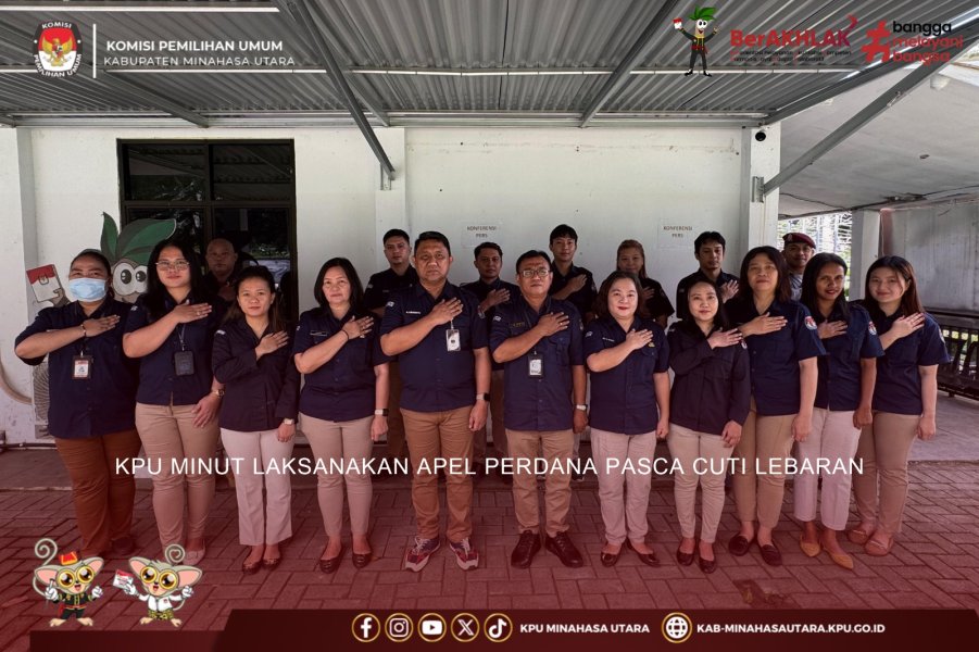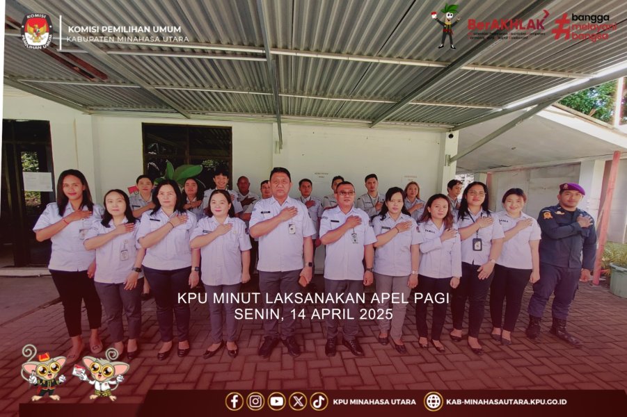 KPU Kabupaten Minahasa Utara (KPU Minut), kembali menggelar Apel Pagi pada Senin (14/04) yang dilaksanakan di halaman kantor. Pembina Apel pada kesempatan kali ini Sekretaris KPU Minahasa Utara Ariesto J. Matantu. Selaku pembina apel Ariesto J. Matantu dalam arahannya mengingatkan seluruh jajaran untuk tetap selalu mengerjakan tugas-tugas sesuai dengan aturan dan cepat tanggap. “Diingatkan untuk selalu mengerjakan tugas-tugas yang menjadi target bulanan kita dan segera dikerjakan ketika ada tugas-tugas dari pimpinan tanpa mengurangi kualitas kerja KPU Minahasa utara ketika di hubungi setiap saat,”tutur Ariesto. Dalam Apel ini, KPU Minut melaksanakan penghormatan terhadap Bendera Merah Putih diiringi Lagu Kebangsaan Indonesia Raya, Mengheningkan Cipta, Pembacaan naskah Pancasila,serta Pembacaan Panca Prasetya Korps Pegawai Republik Indonesia. Turut hadir dalam Apel hari ini yaitu Kasubag serta semua Staf ASN dan PPNPN Sekretariat KPU Minut.