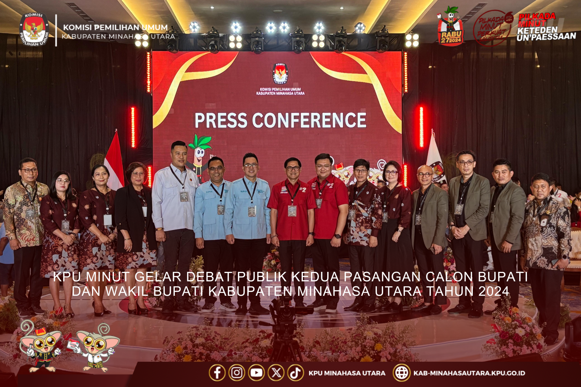 Komisi Pemilihan Umum Kabupaten Minahasa Utara (KPU Minut) menggelar Debat Kedua Calon Bupati dan Wakil Bupati Minahasa Utara Tahun 2024, yaitu antara Pasangan Calon Nomor Urut 1, Melky Jakhin Pangemanan, S.I.P., M.A.P., M.Si dan Christian Kamagi, Ama.TM dengan Pasangan Calon Nomor Urut 2, Joune James Esau Ganda, S.E, M.A.P.,M.M., M.Si dan Kevin William Lotulung, SH, MH bertempat di The Sentra Hotel, Minahasa Utara, Jumat (1/11/2024).
