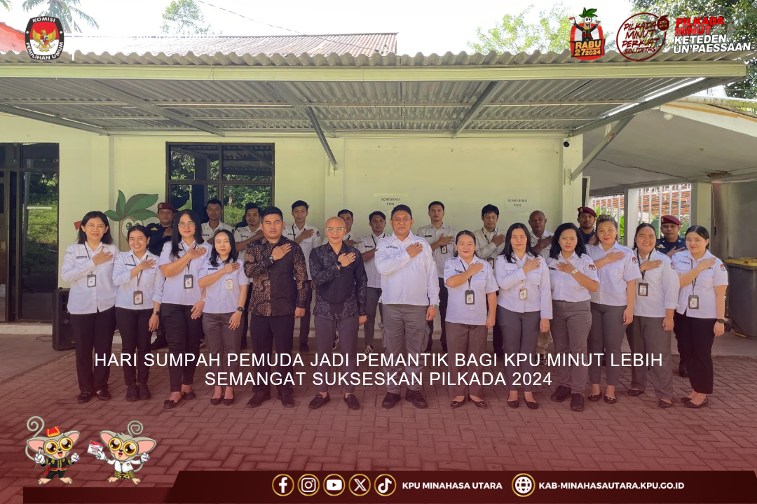 KPU Kabupaten Minahasa Utara menggelar Upacara Peringatan Hari Sumpah Pemuda ke-96 Tahun 2024, di halaman Kantor KPU Minut, Senin (28/10/2024). Adapun Ketua KPU Minut, Hendra Lumanauw sebagai Pembina Upacara. Dalam sambutannya, Hendra menyampaikan momentum tanggal 28 oktober ini menjadi moment yang patut disyukuri dimana sudah 96 tahun komitmen kita dalam berbangsa dan bernegara memegang teguh sumpah pemuda tersebut. Ia mengatakan diusia yang sudah sangat mapan dan sarat pengalaman, 96 tahun menunjukan bangsa Indonesia dalam konteks sumpah pemuda sudah teruji oleh waktu. “Semangat Persatuan dimulai dari tanggal 28 Oktober 1928. Oleh karena itu, momentum ini kita jadikan sebagai pemantik untuk bekerja lebih semangat lagi dalam rangka mensukseskan Pilkada 2024 secara serentak,” tutur Hendra. Lebih lanjut, Hendra menyampaikan semangat sumpah pemuda tahun ini dengan tema Maju Bersama Indonesia Raya ingin menunjukan pemaknaan yang jelas dalam konteks maju berbangsa dan bernegara yang berarti tidak lepas dari persatuan dan kesatuan. “Pilkada Minut Keteden Un'Paesaan, Pilkada Minut perkuat soliditas, tidak mudah tapi bukan tidak mungkin. Bagaimana kita harus menjaga semangat dan soliditas ini, apalagi tanggung jawab dan tantangan kita besar, mewajibkan kita harus siap dan matang,” ujar Hendra mengingatkan jajarannya. Hendra mengajak, dengan semangat Keteden Un'Paesaan, Ia mendorong kepada seluruh jajarannya untuk bekerja sukseskan tahapan Pilkada 2024 dengan hati yang bahagia. “Mari kita selalu bawa dalam doa, kerja-kerja yang kita laksanakan,” tutupnya. Upacara diikuti oleh Ketua Divisi Hukum dan Pengawasan, Hedriyanto Kusno Jacob, Sekretaris KPU Minut, Ariesto Matantu, Pejabat Eselon IV, dan Jajaran Sekretariat KPU Minut lainnya.