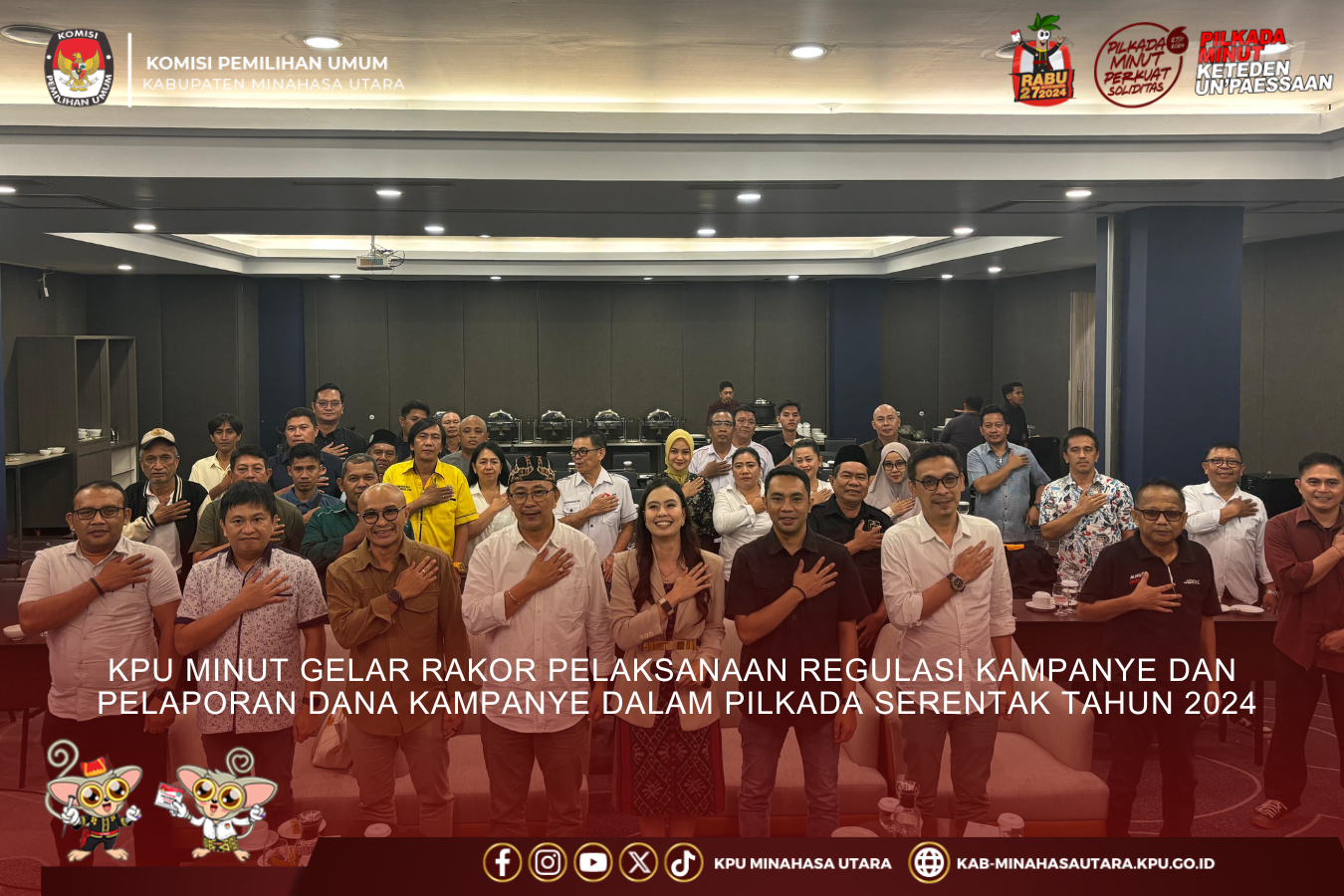 #Temanpemilih, Komisi Pemilihan Umum Kabupaten Minahasa Utara (KPU Minut) menyelenggarakan Rapat Koordinasi Pelaksanaan Regulasi Kampanye Dan Pelaporan Dana Kampanye Dalam Pilkada Serentak Tahun 2024 Yang Partisipatif, Terbuka Dan Berakuntabilitas Publik, Kamis 19/9/2024, di Hotel Sentra Manado.