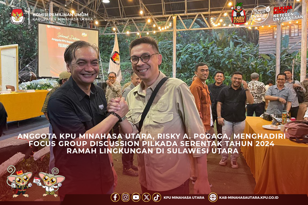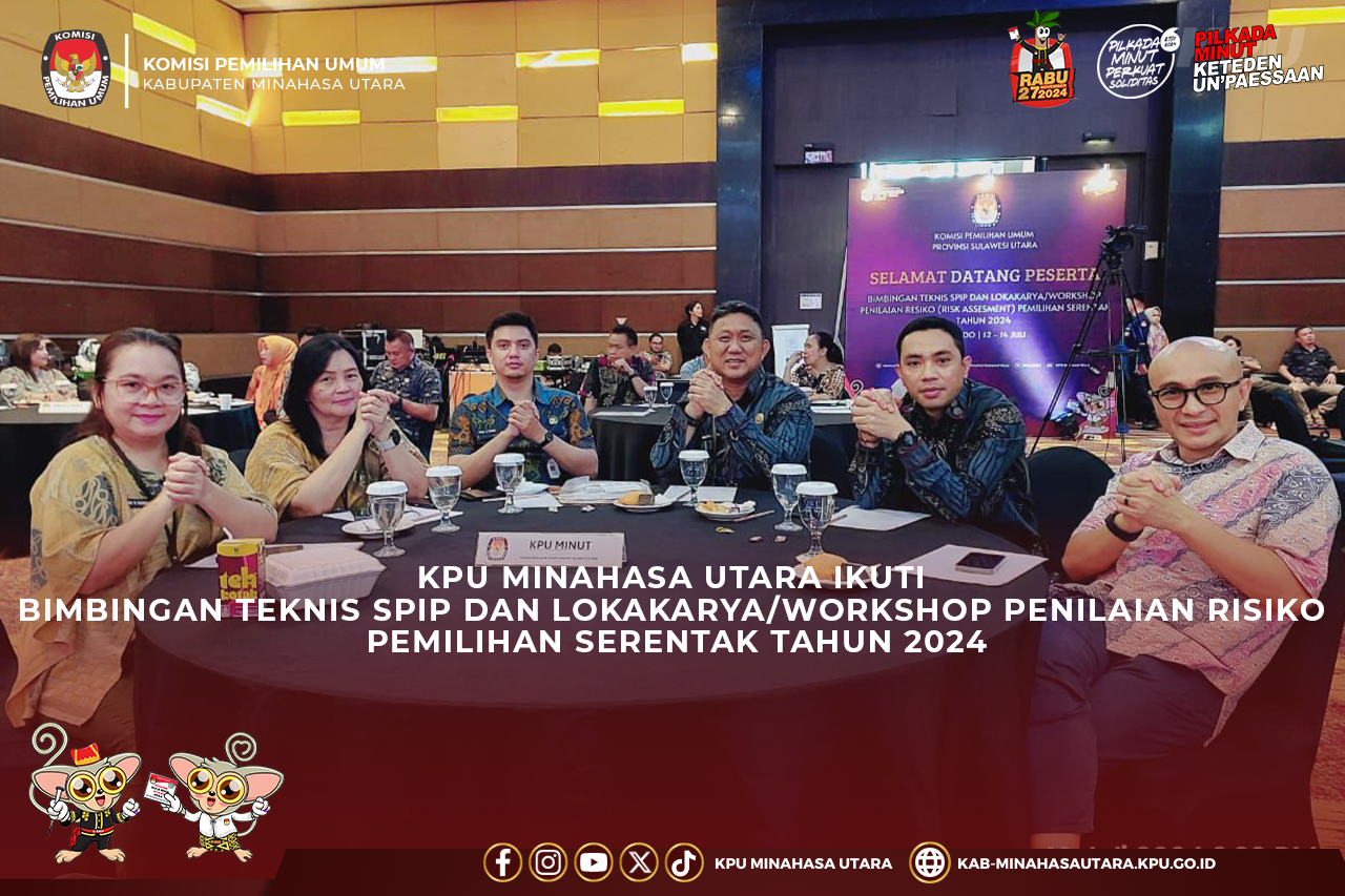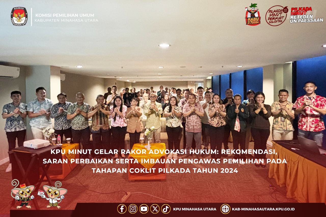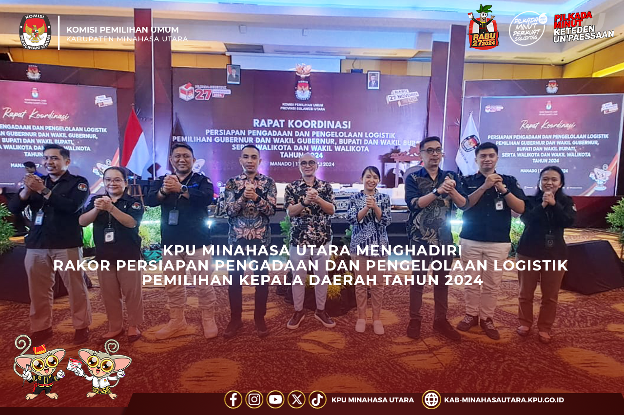 Manado – Ketua dan Anggota KPU Minahasa Utara, Hendra S Lumanauw, Risky A. Pogaga, Ibnu M. Dali dan Irene Buyung bersama dengan Sekretaris KPU Minahasa Utara, Ariesto J. Matantu, Kasubbag Keuangan, Umum dan Logistik, Inri Nangka, PPK, PPBJ dan Operator Silog KPU Minahasa Utara menghadiri kegiatan Rapat Koordiansi Persiapan Pengadaan dan Pengelolaan Logistik Pemilihan Kepala Daerah Tahun 2024 yang dilaksanakan oleh KPU Sulawesi Utara di Grand Kawanua Novotel Manado pada tanggal 17-19 Juli Tahun 2024.