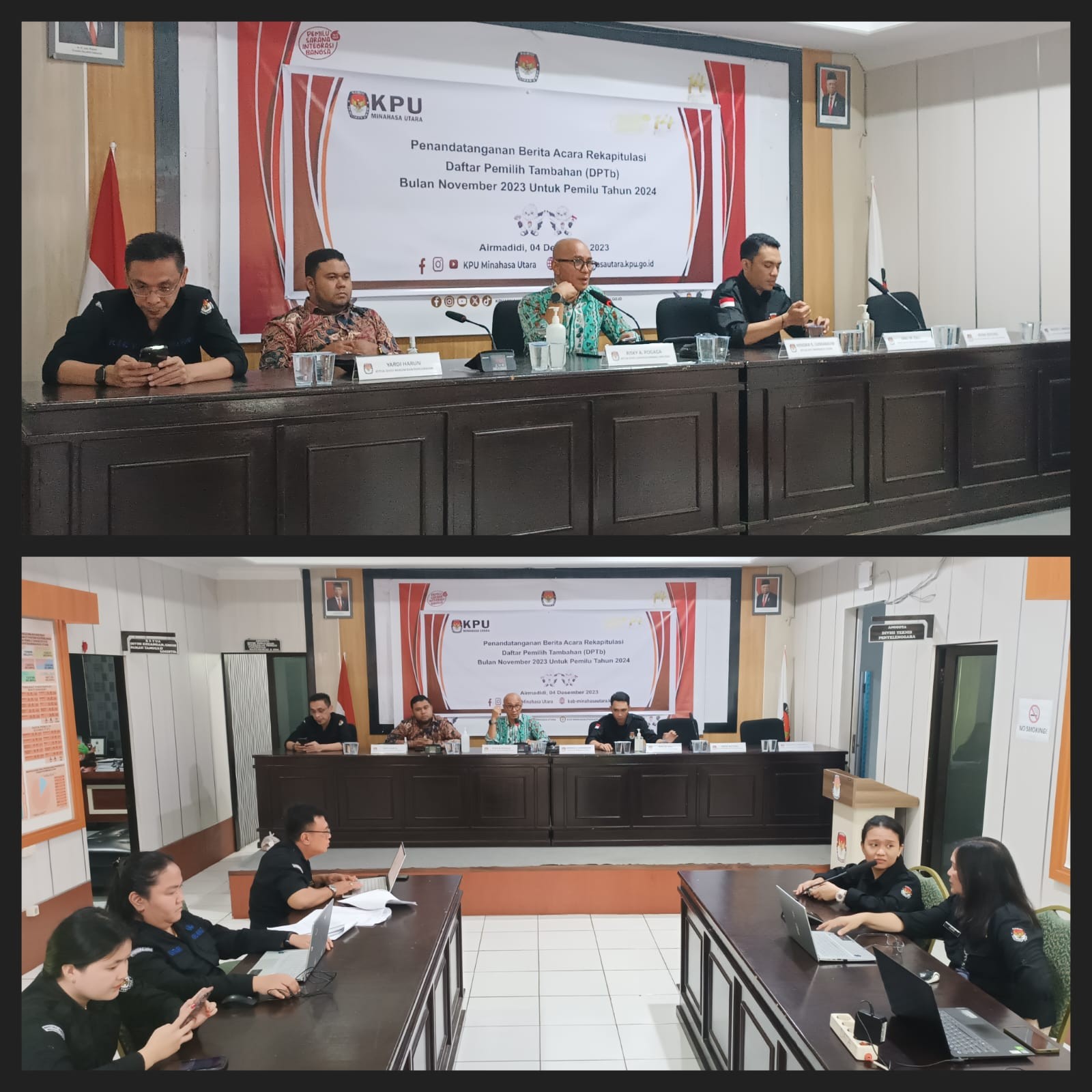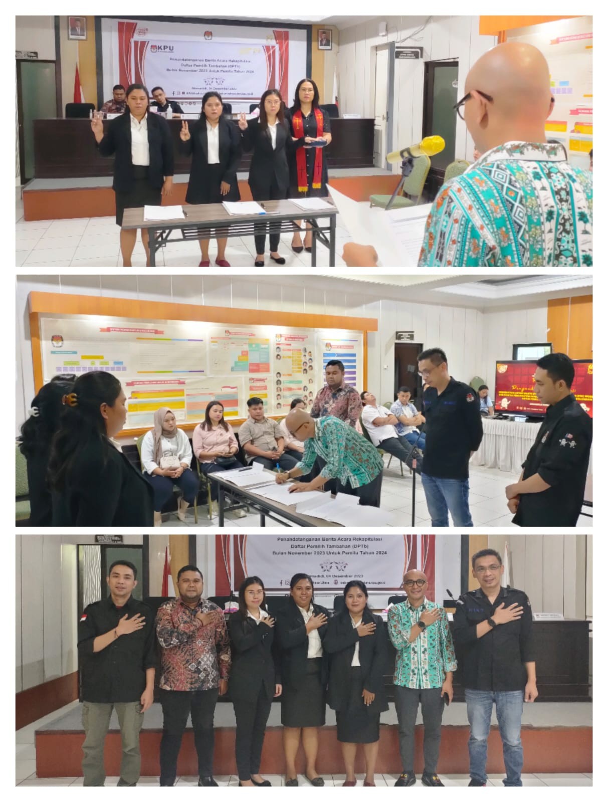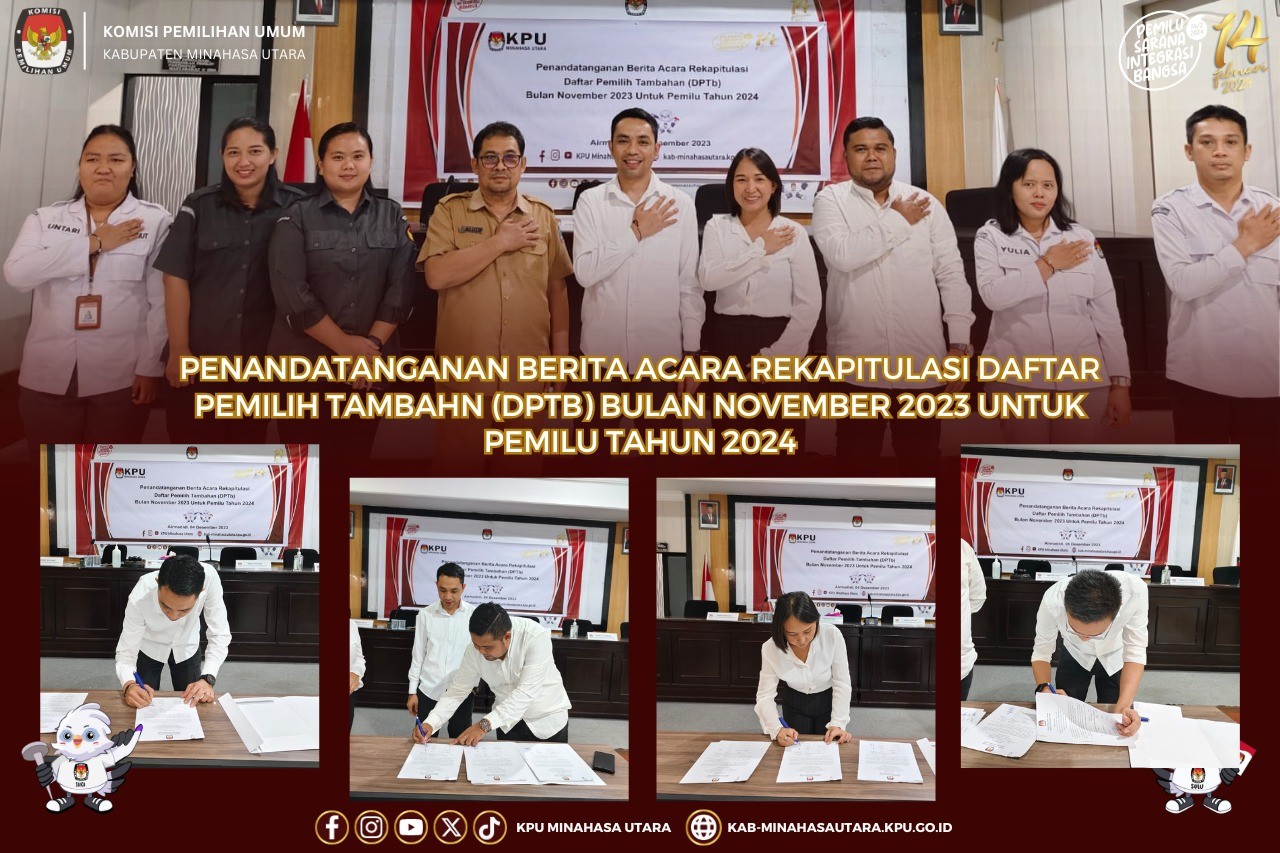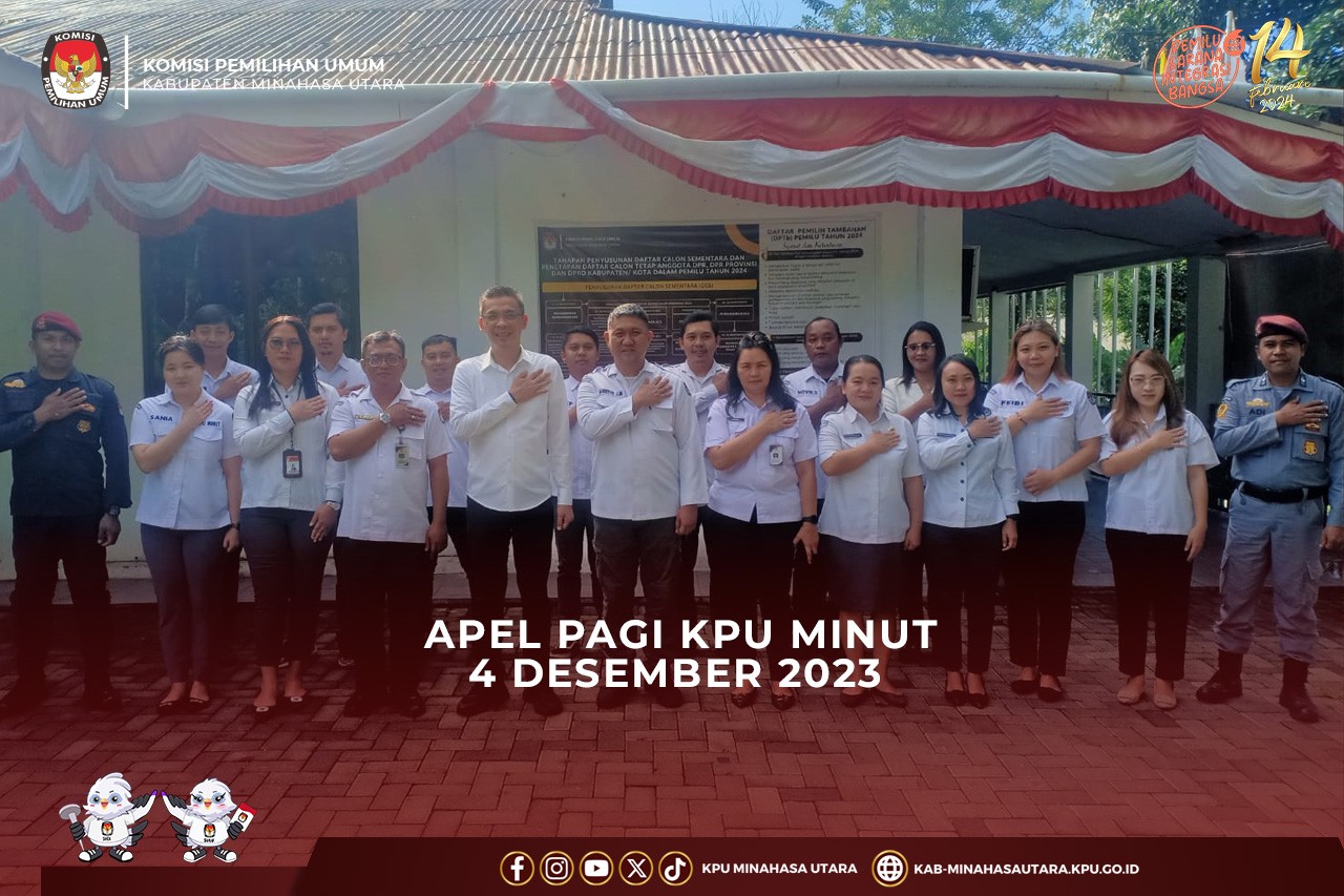 Komisi Pemilihan Umum Kabupaten Minahasa Utara (KPU Minut) menggelar Pelantikan dan Pengambilan Sumpah Janji pengganti anggota Panitia Pemilihan Kecamatan (PPK), dan anggota Panitia Pemungutan Suara (PPS), Rabu (6/12/2023) bertempat di Kantor KPU Kabupaten Minahasa Utara. Adapun pengganti anggota PPK dimaksud adalah 1 Orang PPK Wori dan anggota PPS Desa Kima Bajo dan Desa Kolongan. Pelantikan dilakukan oleh Ketua KPU Minut, Hendra S. Lumanauw, MA. Dalam arahannya, Hendra mengucapkan selamat bergabung anggota PPK dan PPS yang baru dilantik. “Dalam hal ini wilayah kerja PPK tentunya lebih luas dibanding di Desa, untuk itu saya sampaikan PPK segera menyesuaikan dengan kerja-kerja PPK saat ini, dan tentunya juga PPS juga punya tanggung jawab yang besar, apalagi pada saat ini akan dilaksanakan perekrutan KPPS dan PPS mempunyai tanggung jawab untuk membentuk KPPS, untuk itu diharapkan sesegera mungkin berkoordinasi dengan teman-teman PPK dan PPS yang lain” harap Hendra. Turut Hadir dalam giat Anggota KPU Minut Risky A. Pogaga, Ibnu M. Dali, dan Yardi Harun, Kasubbag Hukum dan SDM Jeane Mondoringin, dan Jajaran Staf Sekretariat KPU Minut.