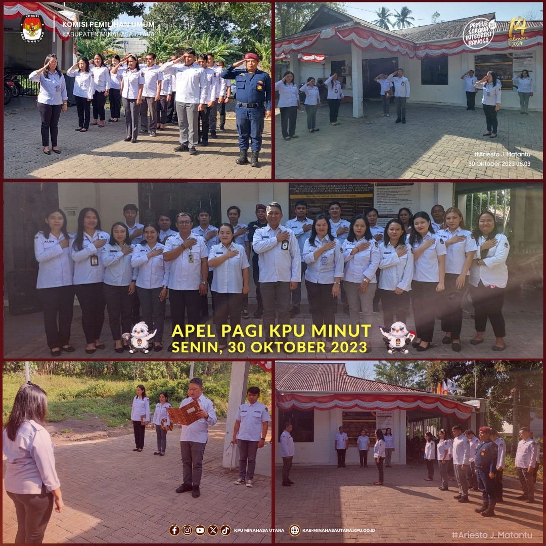 Komisi Pemilihan Umum Kabupaten Minahasa Utara (KPU Minut) menggelar Apel Pagi, Senin (30/10/2023), di halaman Kantor KPU Minut. Adapun Sekretaris KPU Minut, Ariesto J. Matantu,SH, MH bertugas sebagai Pembina Apel Pagi. Dalam arahannya, Ariesto mengapresiasi seluruh jajaran Sekretariat yang menurutnya telah bekerja dengan baik dalam menunjang jalannya tahapan. “Diharapkan jajaran sekretariat dapat mempertahankan bahkan meningkatkan etos kerja yang sudah berjalan dengan baik ini,” ujarnya mengingatkan. Ariesto menambahkan, tahapan dan jadwal Pemilu di tahun 2023 ini akan semakin padat dan beririsan, Ia berharap seluruh jajaran Sekretariat mampu mempersiapkan diri menghadapi hal tersebut demi suksesnya penyelenggaraan Pemilu serentak Tahun 2024. “Kita akan menghadapi tahapan penetapan DCT dan tahapan persiapan logistik. Diharapkan jajaran Sekretariat dapat mempersiapkan diri sebaik mungkin dan senantiasa menjaga kesehatan menghadapi tahapan yang semakin padat ini,” tutupnya.