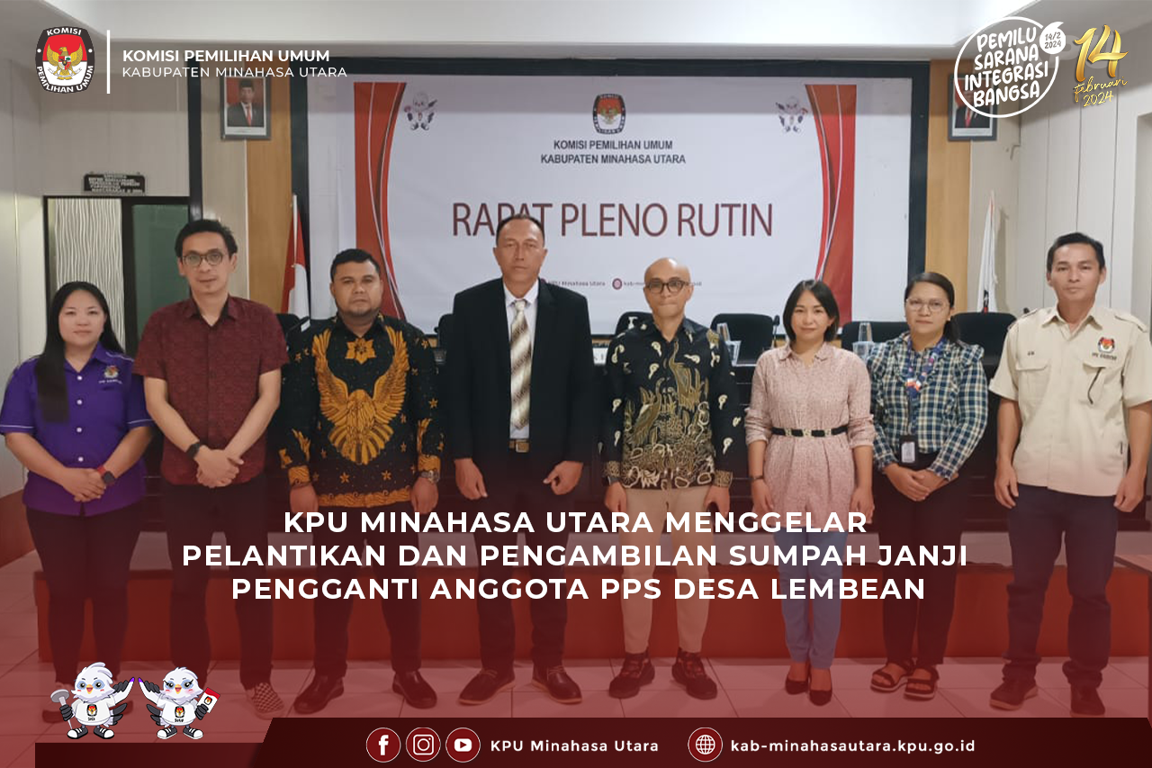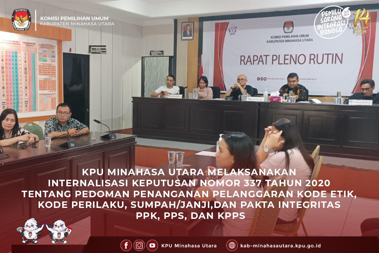 Komisi Pemilihan Umum Kabupaten Minahasa Utara (KPU Minut) melaksanakan Internalisasi Keputusan Nomor 337 Tahun 2020 Tentang Pedoman Penanganan Pelanggaran Kode Etik, Kode Perilaku, Sumpah/Janji,dan Pakta Integritas PPK, PPS, dan KPPS (6/10/2023). Kegiatan Internalisasi dibuka Oleh Ketua Divisi Hukum dan Pengawasan KPU Minut Yardi Harun.