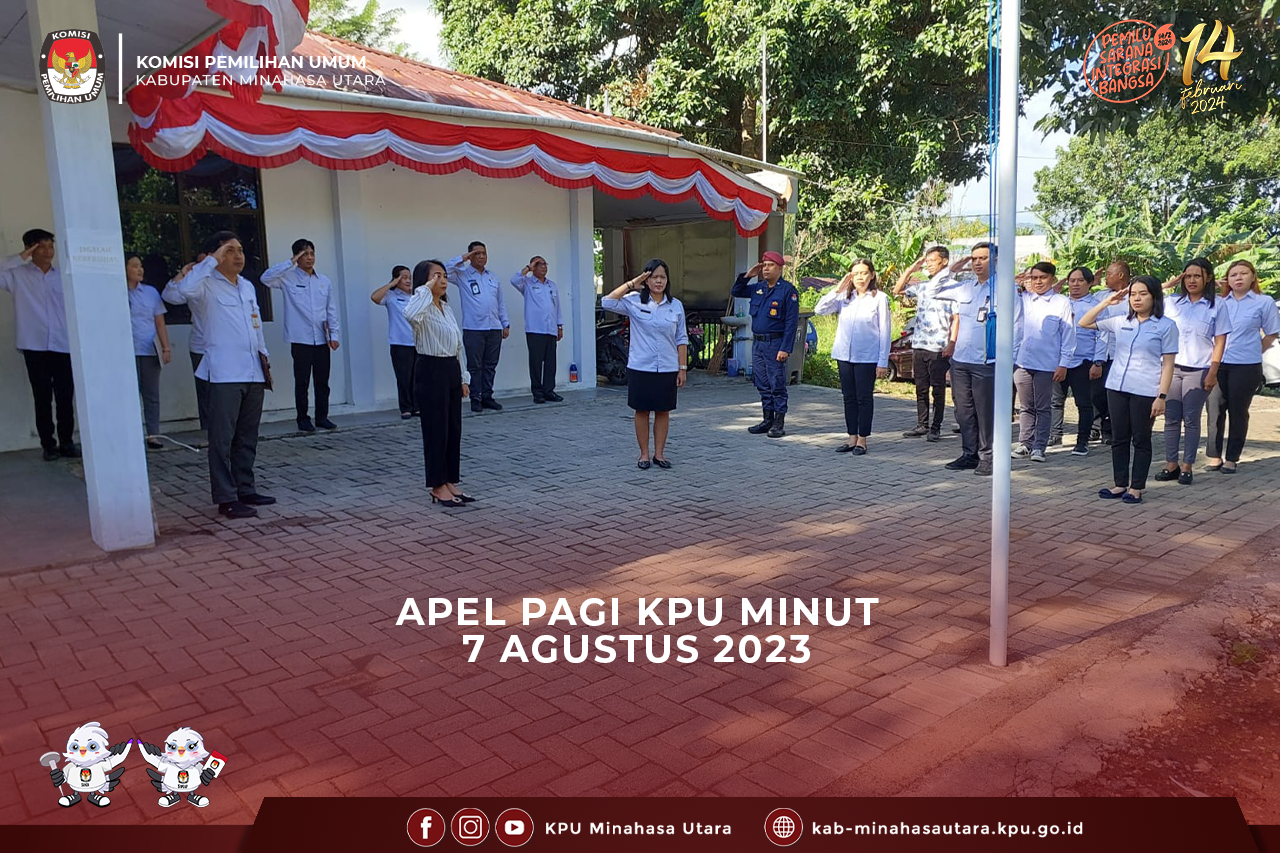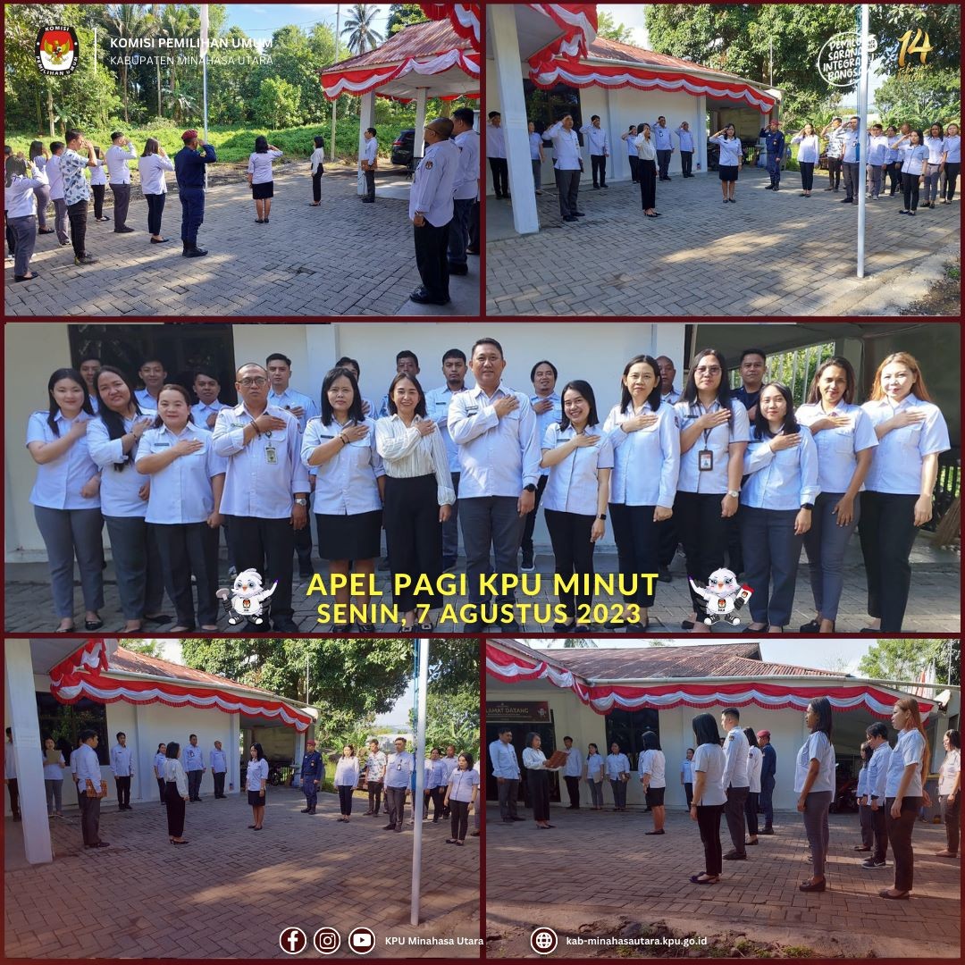 Apel pagi setiap hari Senin dilaksanakan sesuai dengan Surat Edaran Ketua KPU RI Nomor 604/SDM.03.5-SD/05/KPU/VI/2021 perihal Himbauan Pelaksanaan Apel Pagi. Dalam Apel ini, KPU Minut melaksanakan penghormatan terhadap Bendera Merah Putih diiringi Lagu Kebangsaan Indonesia Raya, Mengheningkan Cipta, Pembacaan naskah Pancasila,serta Pembacaan Panca Prasetya Korps Pegawai Republik Indonesia.