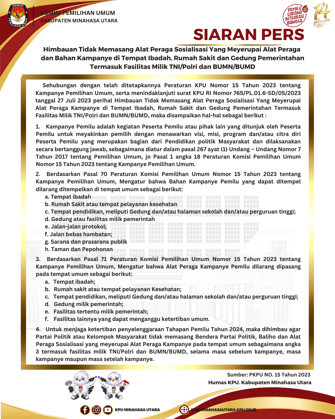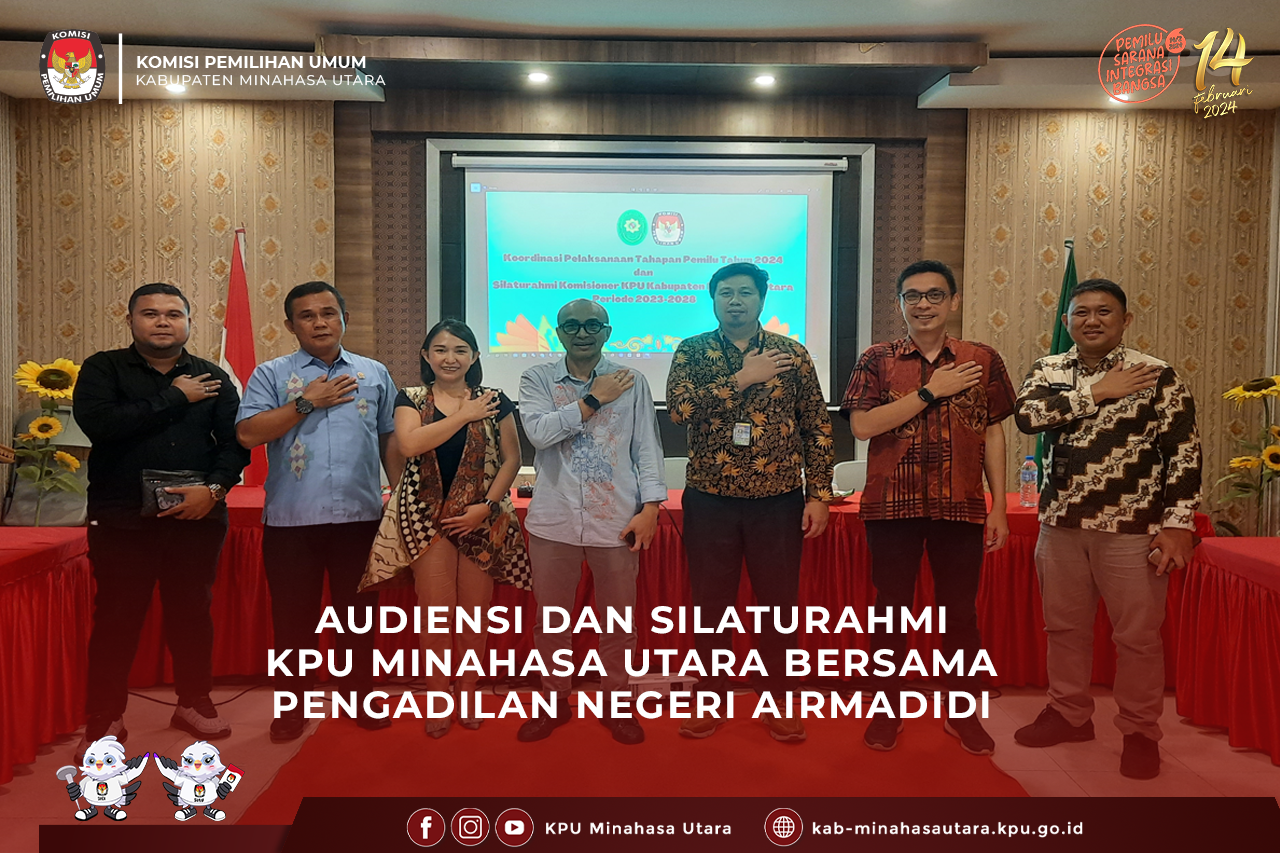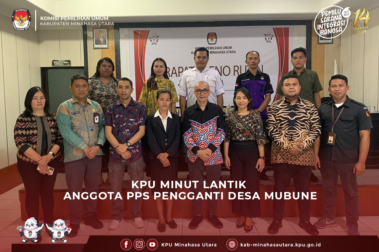 Komisi Pemilihan Umum Kabupaten Minahasa Utara (KPU Minut) menggelar Pelantikan dan Pengambilan Sumpah Janji pengganti anggota Panitia Pemungutan Suara (PPS), Kamis (4/8/2023) bertempat di Kantor KPU Kabupaten Minahasa Utara. Adapun pengganti anggota PPS dimaksud adalah 1 orang di PPS Desa Mubune, Kecamatan Likupang Barat atas nama Marianti Ninsi Iriani Hiwoyang. Pelantikan dilakukan oleh Ketua KPU Minut, Hendra S. Lumanauw, MA. Dalam arahannya, Hendra mengucapkan selamat bergabung menjadi penyelenggara Pemilu. “Kami berharap agar segera beradaptasi. Ketua PPS Mubune kiranya bisa segera memberikan arahan agar dapat menyesuaikan dengan kerja-kerja tahapan yang ada,” harap Hendra. Hendra mengingatkan agar PPS Mubune juga berkoordinasi dan berkomunikasi dengan stakeholder terkait dengan adanya penggantian anggota PPS di Desa Mubune. “Bangun komunikasi yang baik dengan PPK Likupang Barat selaku pengendali tahapan di wilayah Kecamatan,” pesannya. Turut hadir Ketua Divisi Teknis Penyelenggaraan, Ibnu M. Dali, Ketua Divisi Perencanaan, Data, dan Informasi, serta Ketua Divisi Hukum dan Pengawasan, Yardi Harun. Hadir pula Ketua dan Anggota PPK Likupang Barat serta Ketua dan Anggota PPS Desa Mubune menyaksikan proses pelantikan dan pengambilan sumpah janji.