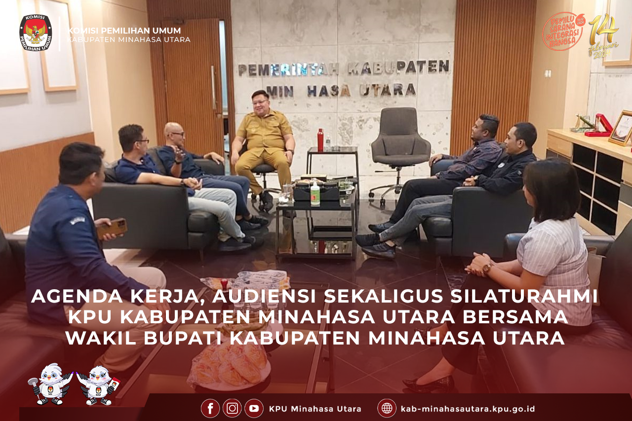 Airmadidi, Ketua KPU Kabupaten Minahasa Utara, Hendra S. Lumanauw bersama Anggota Ireine Buyung, Ibnu Dali, Risky Pogaga dan Yardi Harun serta Sekretaris Ariesto Matantu melakukan agenda kerja Audiensi sekaligus Silaturahmi bersama Wakil Bupati Minahasa Utara, Kevin W. Lotulung, S.H., M.H pada Selasa (25/7/23) di Ruang Kerja Wakil Bupati Kabupaten Minahasa Utara.