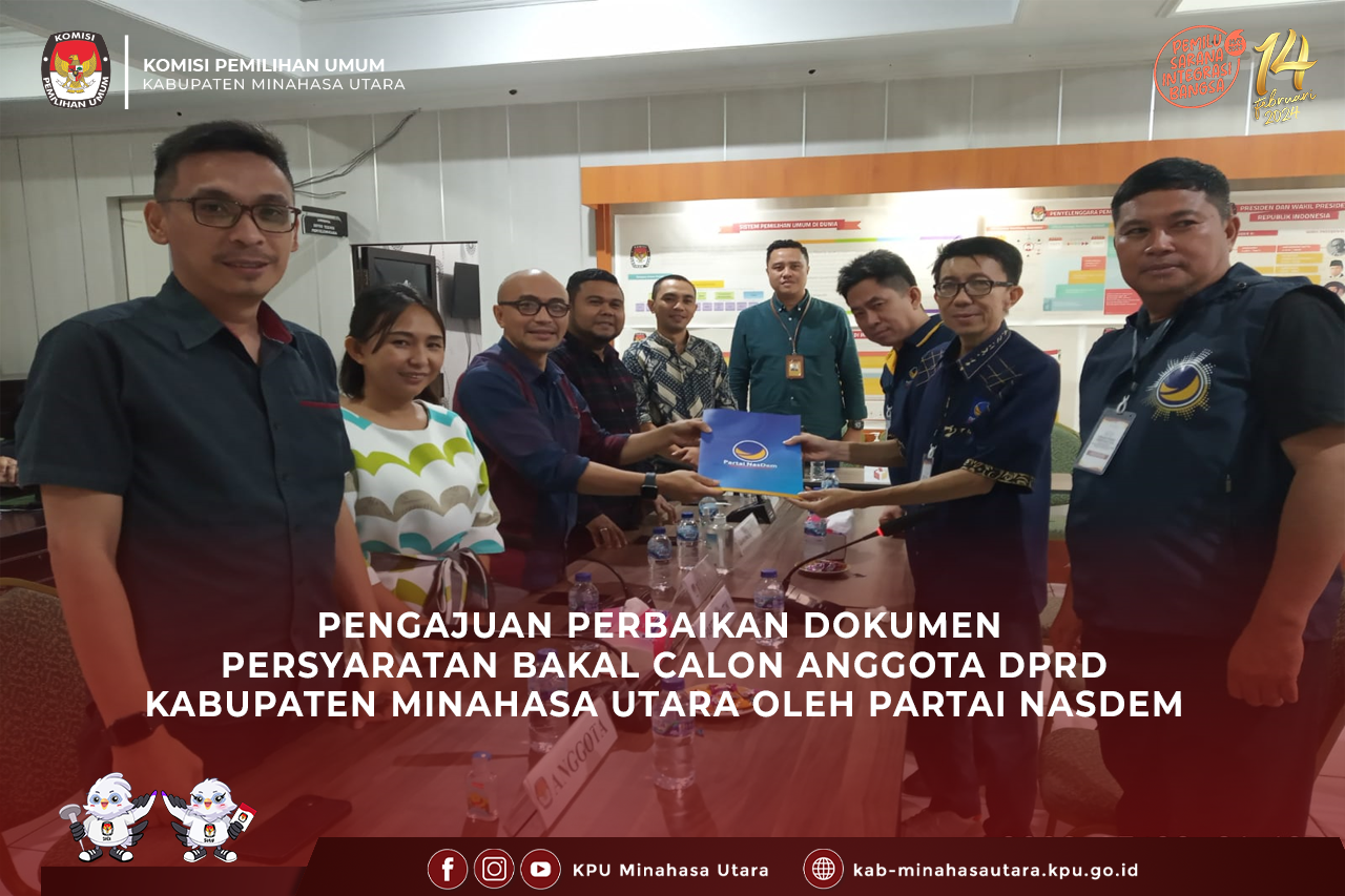 Partai NasDem mengajukan Perbaikan Dokumen Persyaratan Bakal Calon Anggota DPRD Kabupaten Minahasa Utara Pemilu Tahun 2024, Minggu (9/7/2023) di Kantor KPU Kabupaten Minahasa Utara.