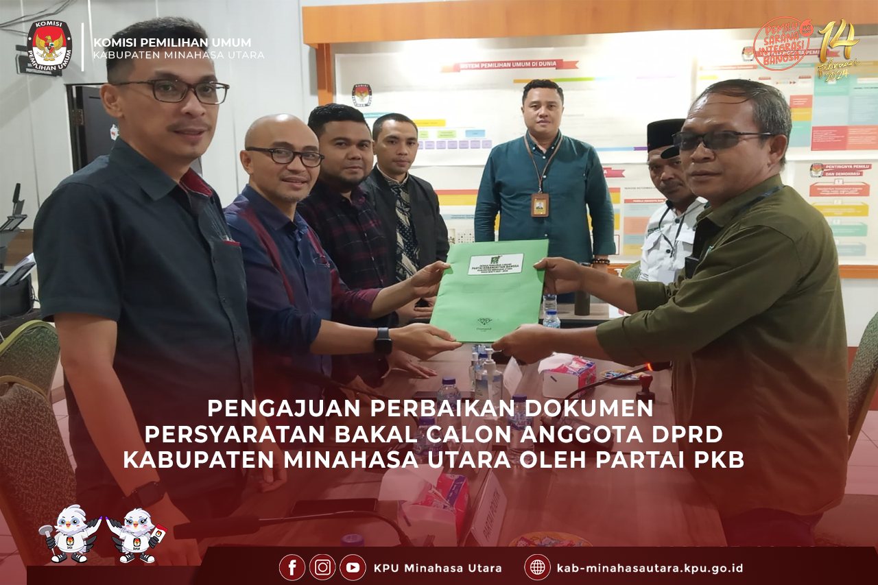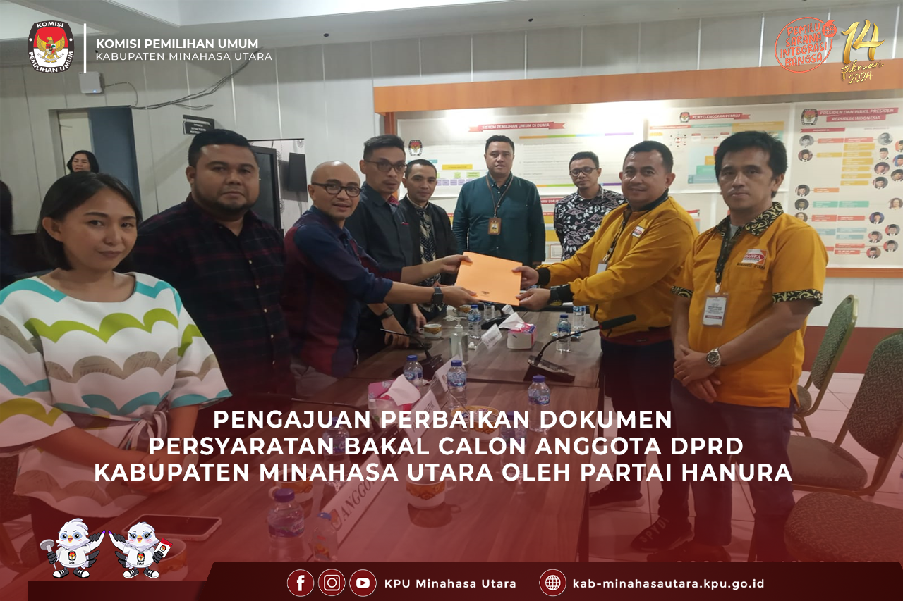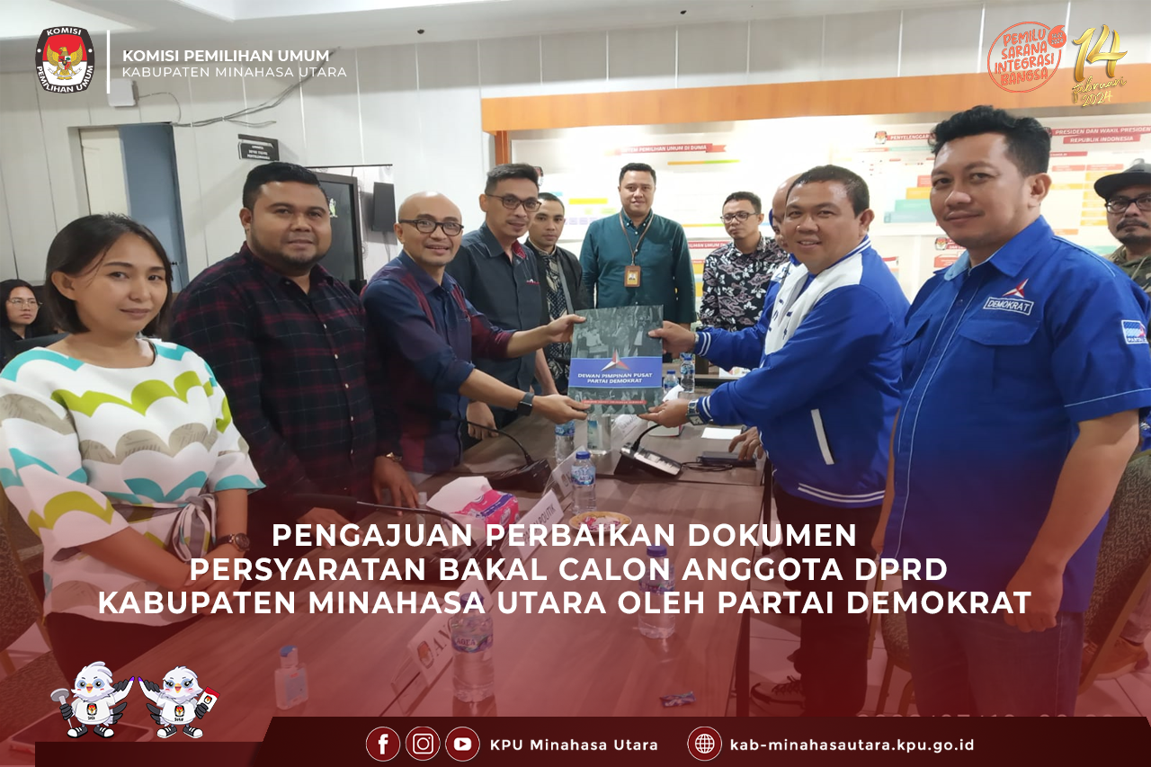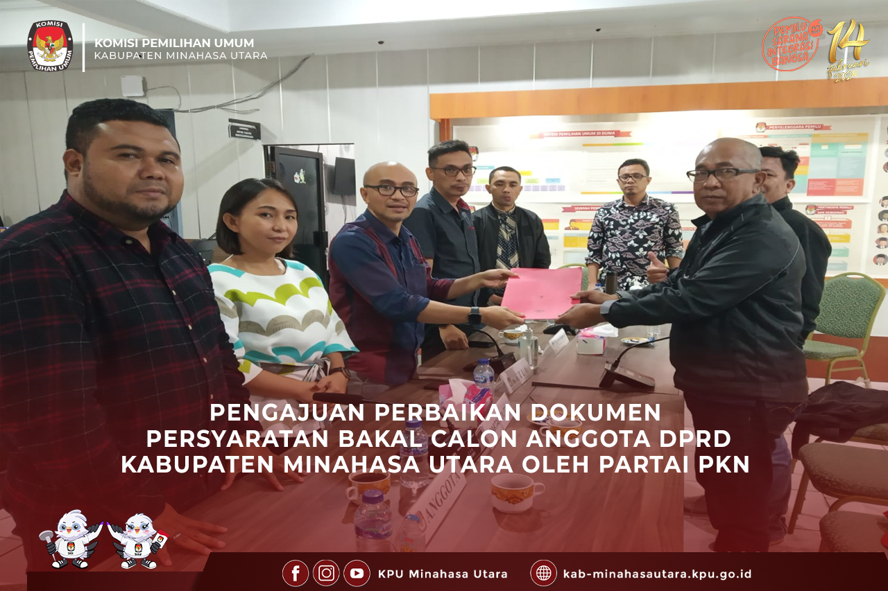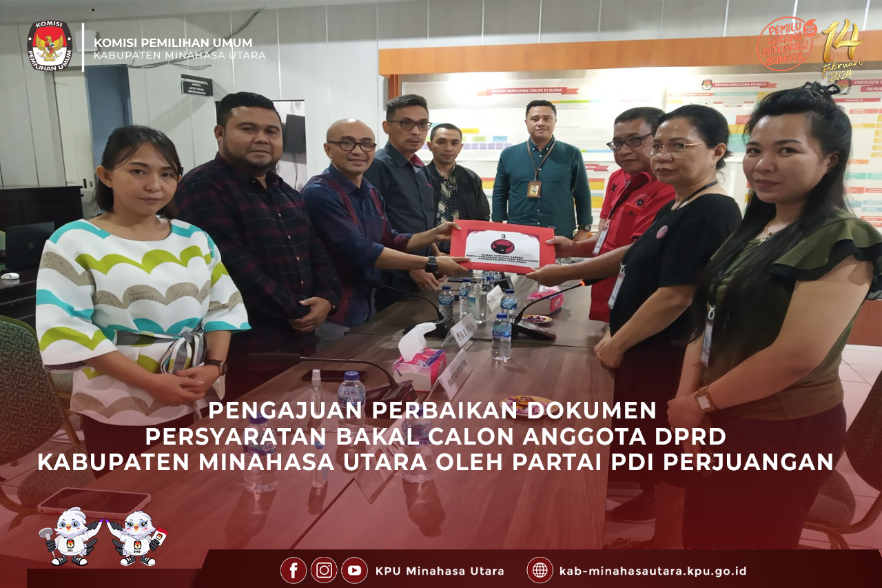 Delegasi partai diterima oleh Ketua KPU Kabupaten Minahasa Utara Hendra S. Lumanauw, Anggota KPU Kabupaten Minahasa Utara Ibnu M. Dali, Risky A. Pogaga, Ireine Buyung dan Yardi Harun bersama Kepala Subbagian Teknis Penyelenggaraan Pemilu, Paritisipasi, dan Hubungan Masyarakat, Fikri Tjikoa serta disaksikan oleh Bawaslu Kabupaten Minahasa Utara, di Ruang Rapat KPU Kabupaten Minahasa Utara.
