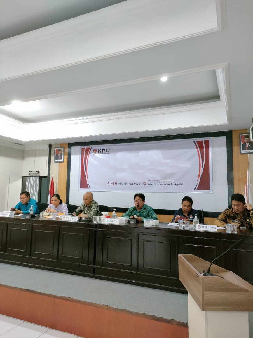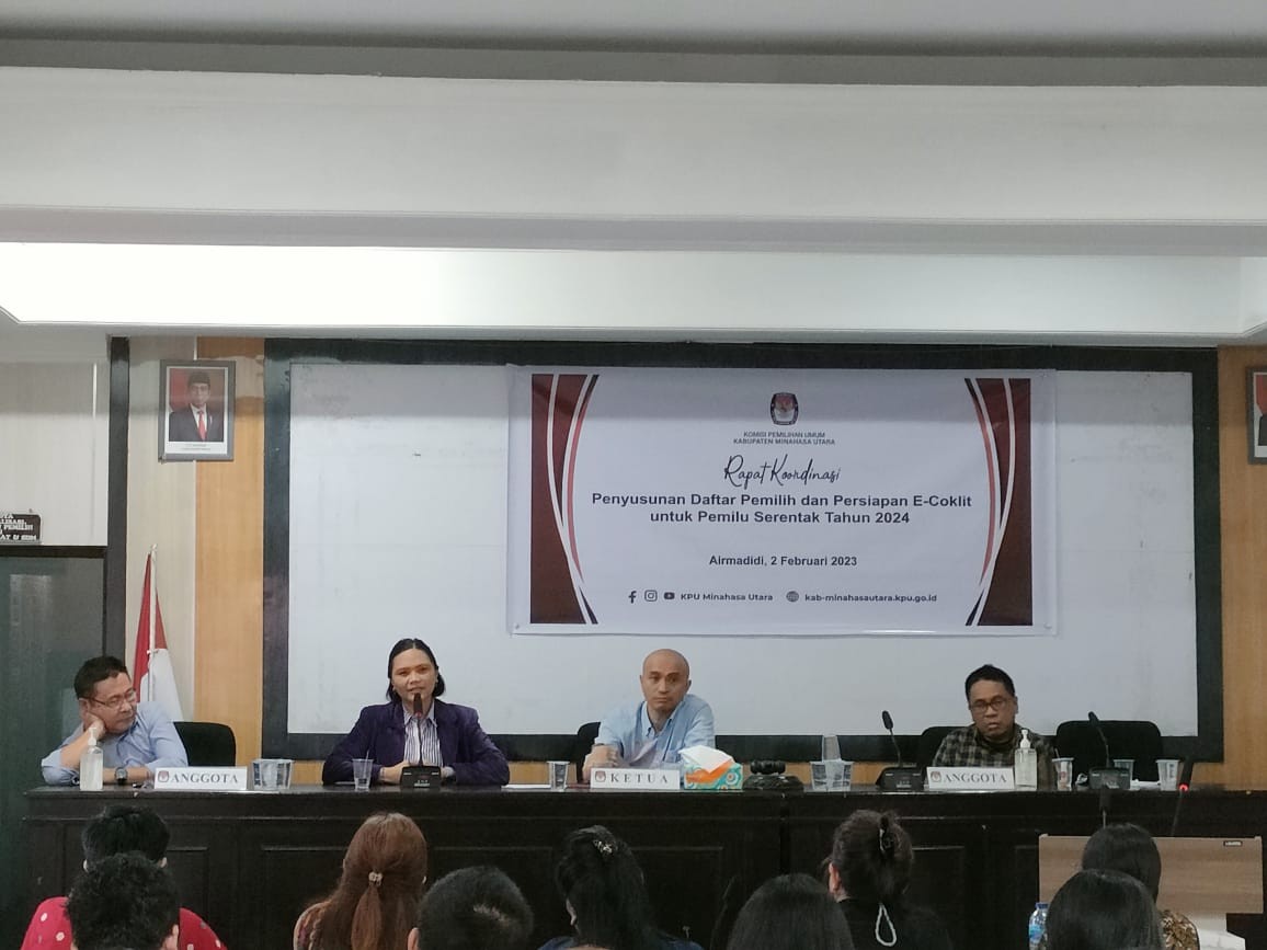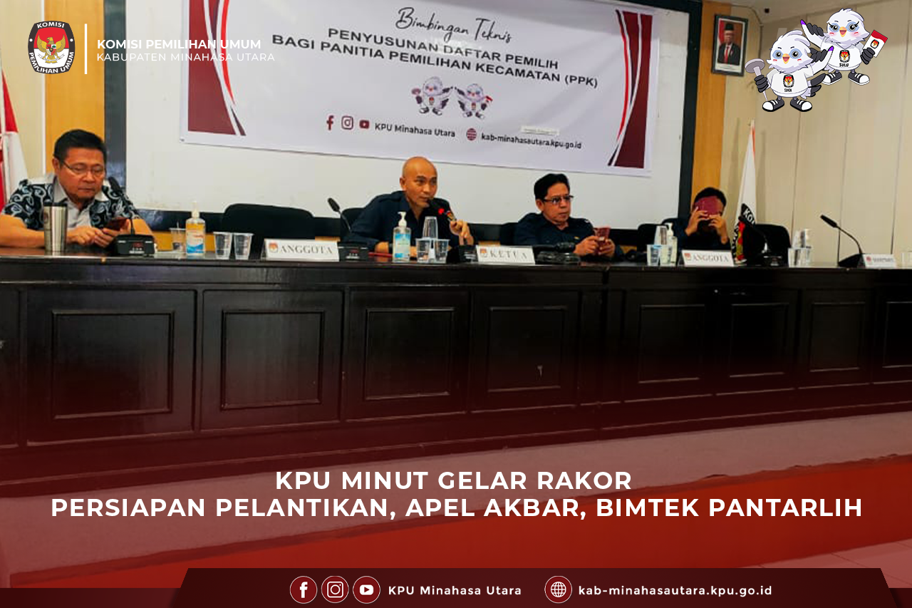 Komisi Pemilihan Umum Kabupaten Minahasa Utara (KPU Minut) menggelar Rapat Koordinasi (Rakor) Persiapan Pelantikan, Apel Akbar, Bimbingan Teknis Panitia Pemutakhiran Data Pemilih (Pantarlih) bersama Panitia Pemilihan Kecamatan (PPK) dan Panitia Pemungutan Suara (PPS) se-Minut, Selasa (7/2/2023).