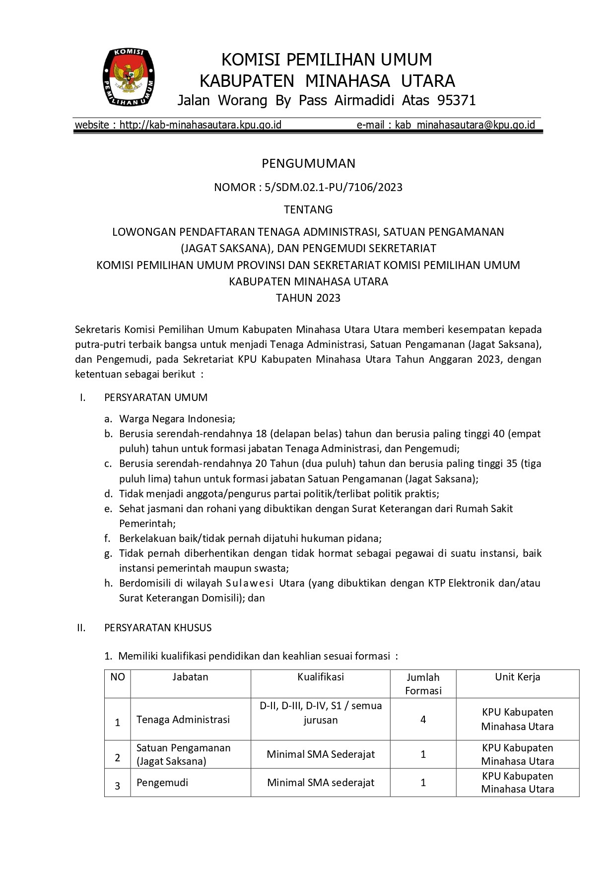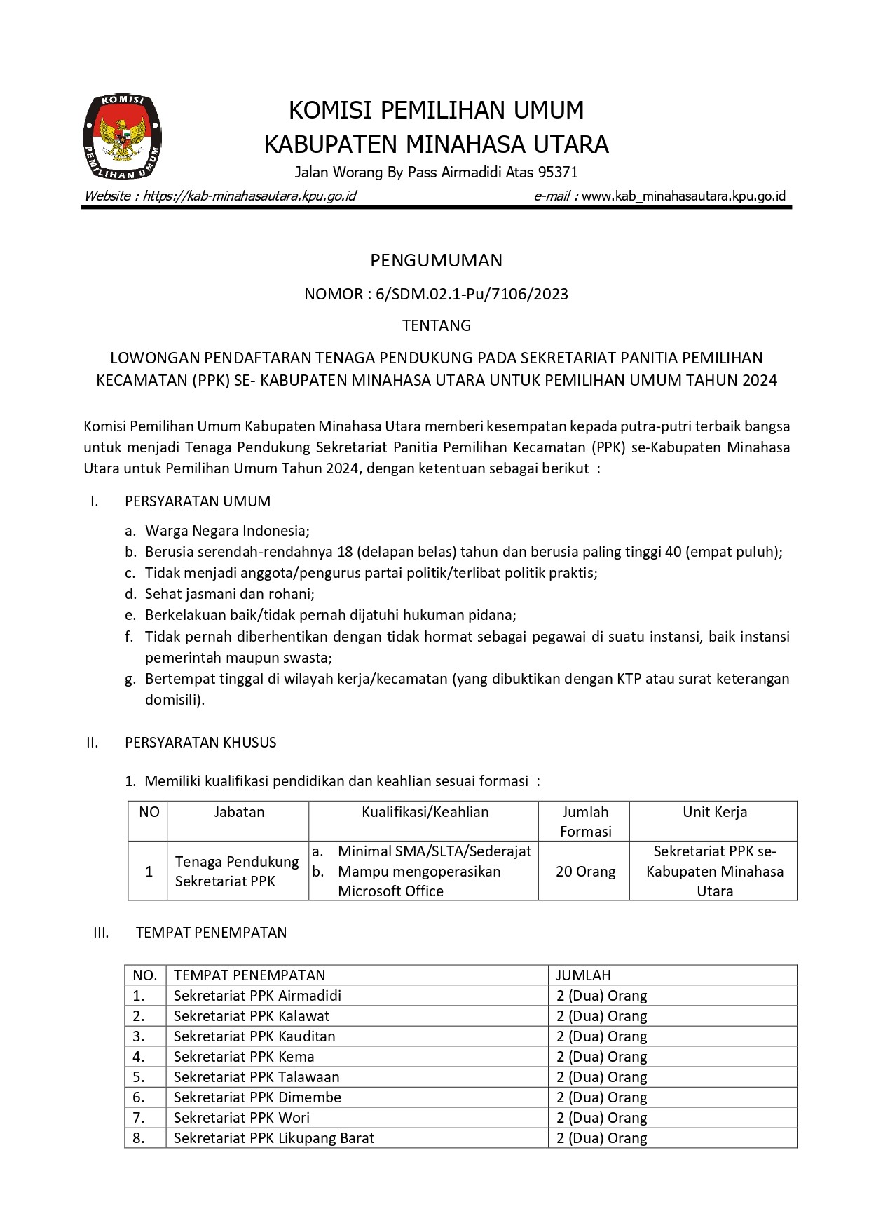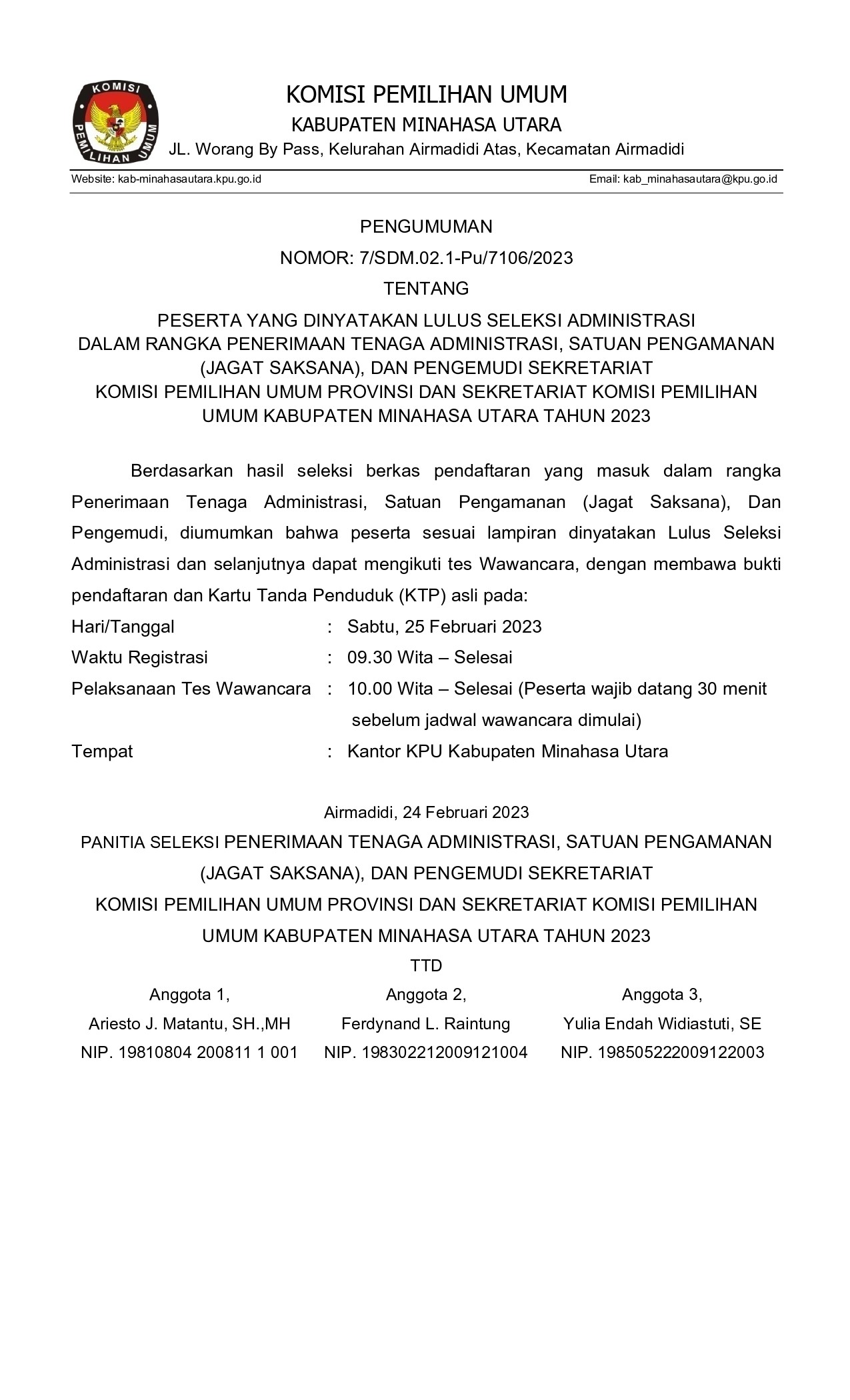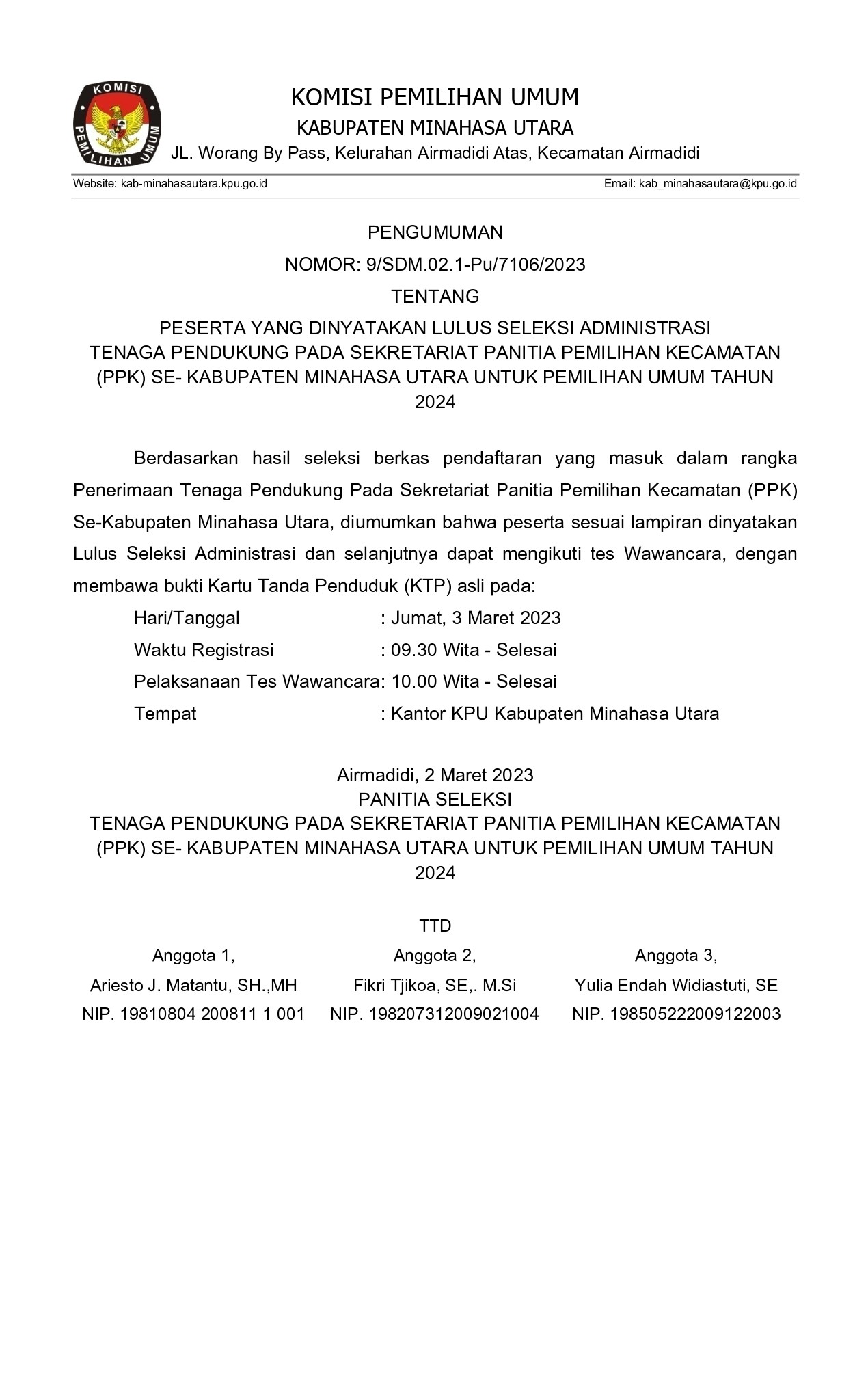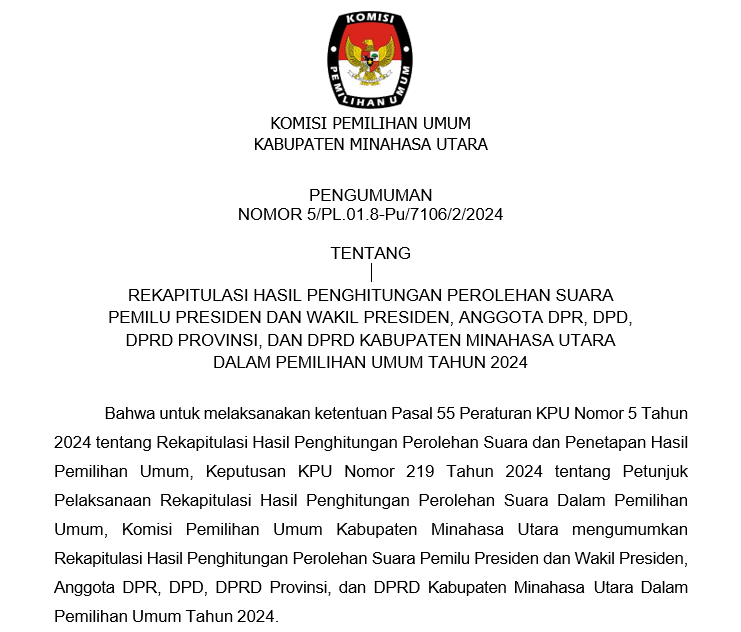 Bahwa untuk melaksanakan ketentuan Pasal 55 Peraturan KPU Nomor 5 Tahun 2024 tentang Rekapitulasi Hasil Penghitungan Perolehan Suara dan Penetapan Hasil Pemilihan Umum, Keputusan KPU Nomor 219 Tahun 2024 tentang Petunjuk Pelaksanaan Rekapitulasi Hasil Penghitungan Perolehan Suara Dalam Pemilihan Umum, Komisi Pemilihan Umum Kabupaten Minahasa Utara mengumumkan Rekapitulasi Hasil Penghitungan Perolehan Suara Pemilu Presiden dan Wakil Presiden, Anggota DPR, DPD, DPRD Provinsi, dan DPRD Kabupaten Minahasa Utara Dalam Pemilihan Umum Tahun 2024.