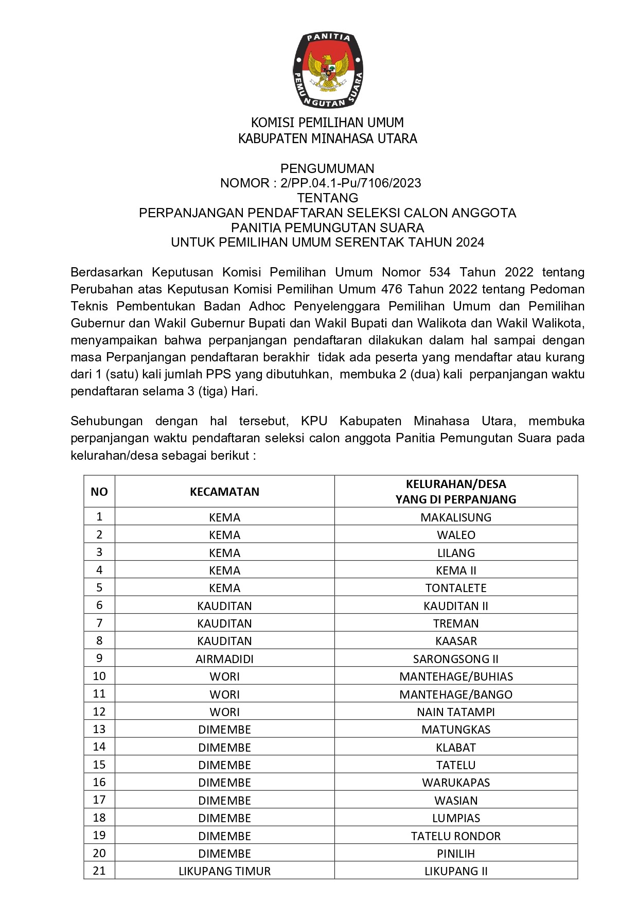 KPU Melakukan Perpanjangan Kedua untuk Pendaftaaran Seleksai Calon Anggota Panitia Pemungutan Suara (PPS) Untuk Pemilihan Serentak Tahun 2024.