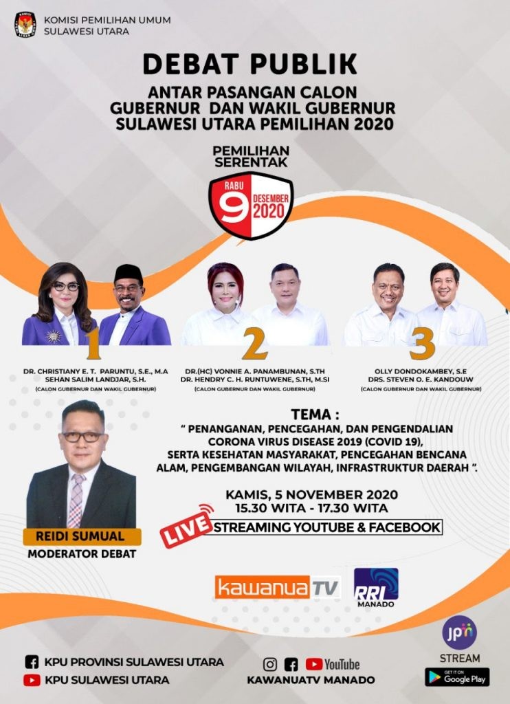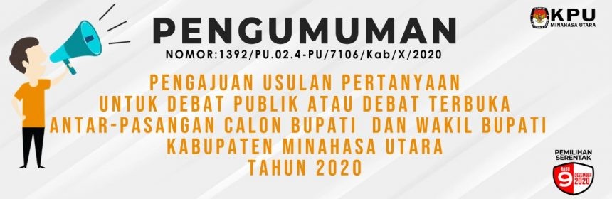 Memerhatikan ketentuan pasal 5 ayat (3) Peraturan Komisi Pemilihan Umum Nomor 4 Tahun 2017 tentang Kampanye Pemilihan Gubernur dan Wakil Gubernur, Bupati dan Wakil Bupati, dan/atau Wali Kota dan Wakil Wali Kota sebagaimana diubah dengan Peraturan Komisi Pemilihan Umum Nomor 11 Tahun 2020 tentang Perubahan Atas Peraturan Komisi Pemilihan Umum Nomor 4 Tahun 2017 tentang Kampanye Pemilihan Gubernur dan Wakil Gubernur, Bupati dan Wakil Bupati, dan/atau Wali Kota dan Wakil Wali Kota, dan Keputusan Komisi Pemilihan Umum Nomor 465/PL.02.4-Kpt/06/KPU/IX/2020 Tentang Pedoman Teknis Pelaksanaan Kampanye Pada Pemilihan Gubernur Dan Wakil Gubernur, Bupati Dan Wakil Bupati, Dan/Atau Wali Kota Dan Wakil Wali Kota Tahun 2020. Komisi Pemilihan Umum Kabupaten Minahasa Utara dengan ini memberikan kesempatan yang seluas-luasnya bagi masyarakat Minahasa Utara untuk mengajukan usulan pertanyaan dalam debat publik atau debat terbuka antar-pasangan calon Bupati Dan Wakil Bupati Minahasa Utara Pemilihan Tahun 2020 untuk dijadikan bahan referensi Tim Penyusun Materi Debat. Pengumuman KPU Minahasa Utara nomor : 1392/PL.02.4-PU/7106/Kab/X/2020 Download : Klik disini