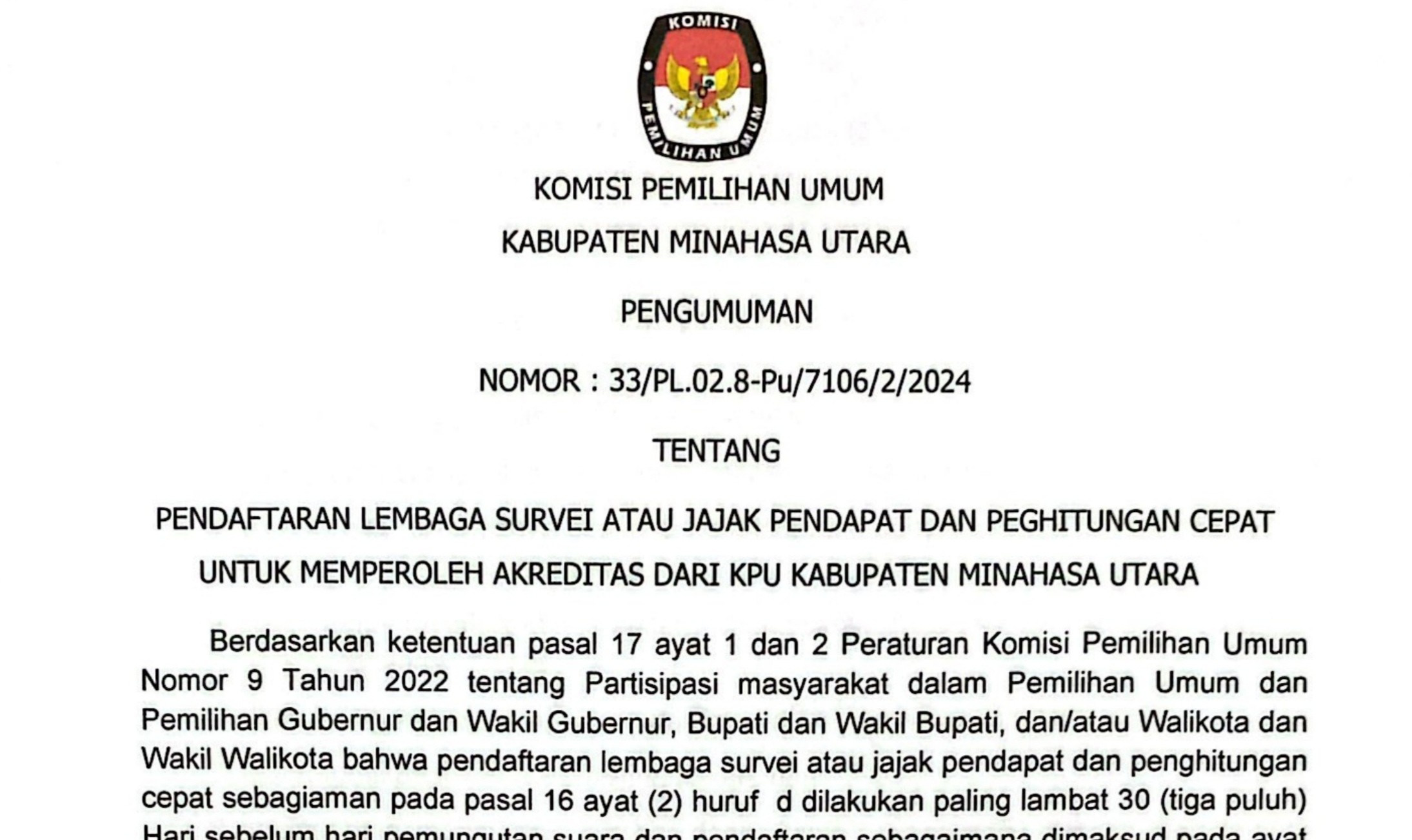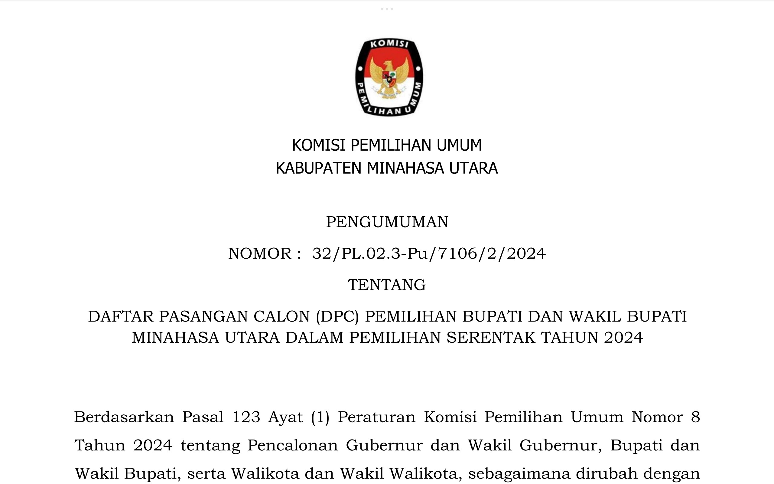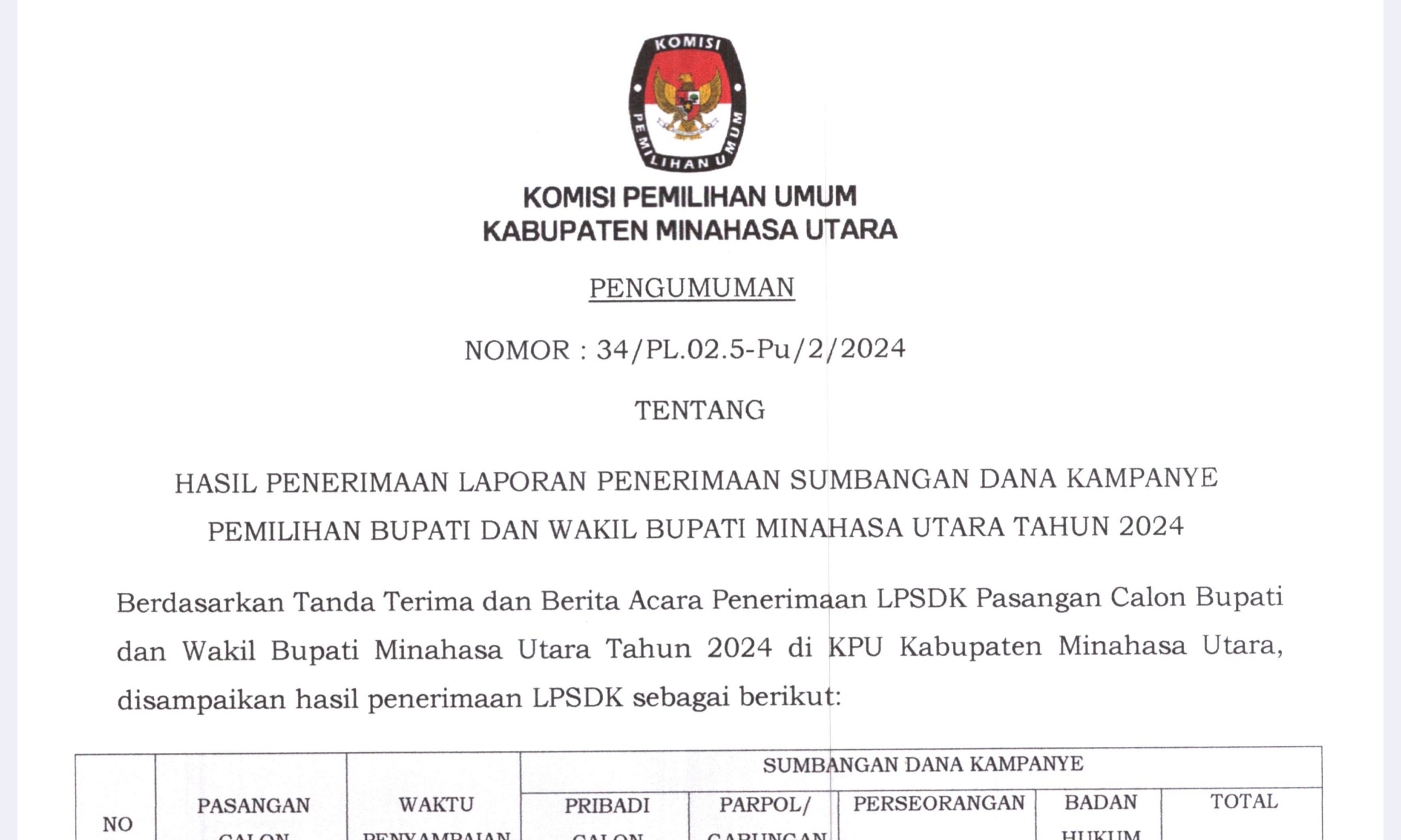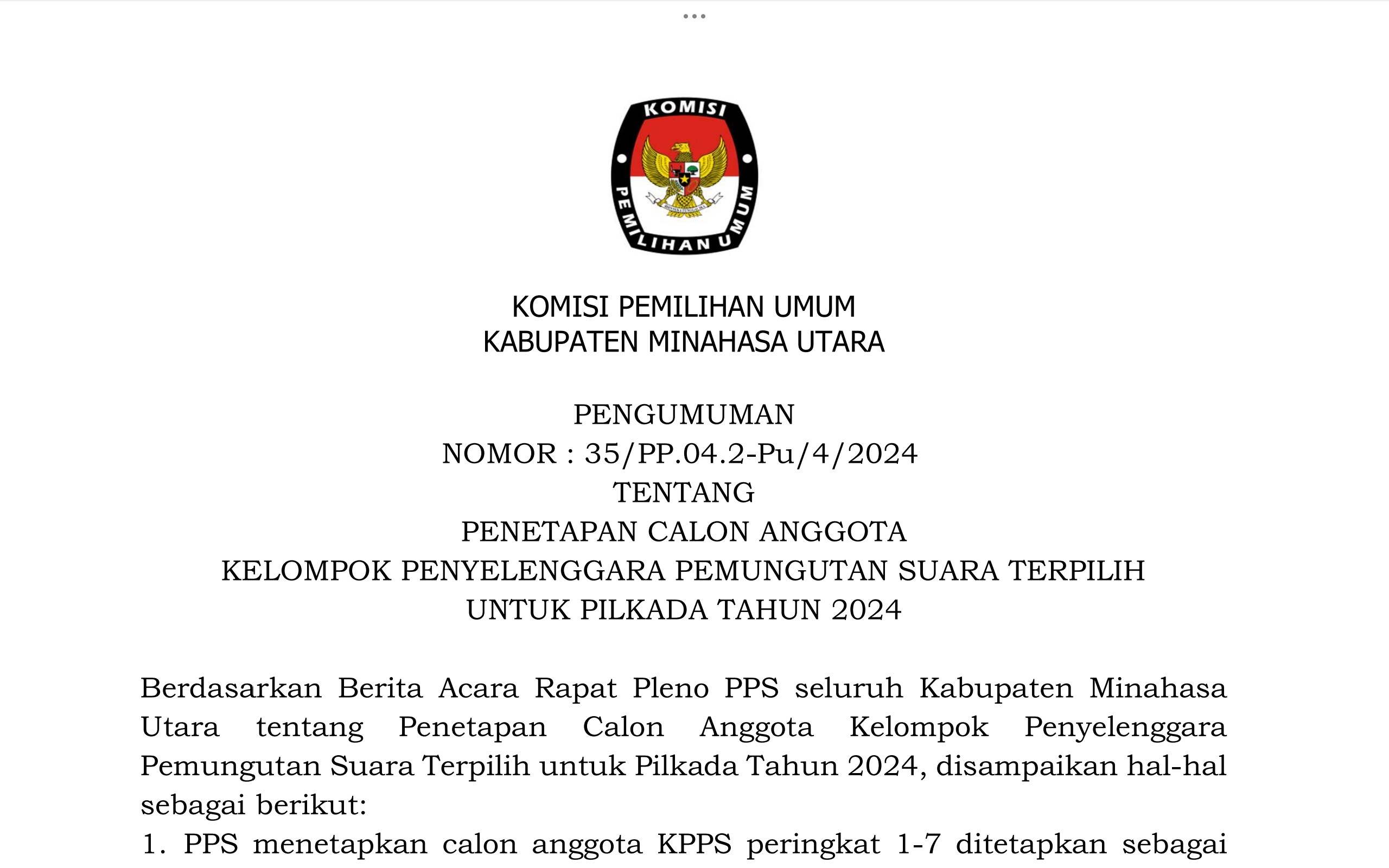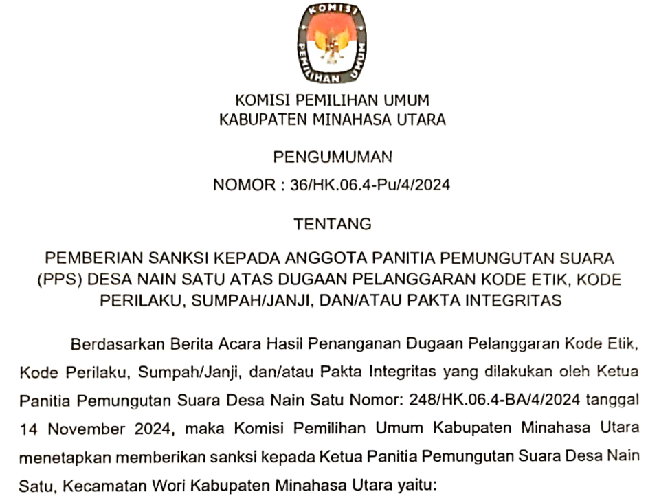 Berdasarkan Berita Acara Hasil Penanganan Dugaan Pelanggaran Kode Etik, Kode Perilaku, Sumpah/Janji, dan/atau Pakta Integritas yang dilakukan oleh Ketua Panitia Pemungutan Suara Desa Nain Satu Nomor: 248/HK.06.4-BA/4/2024 tanggal 14 November 2024, maka Komisi Pemilihan Umum Kabupaten Minahasa Utara menetapkan memberikan sanksi kepada Ketua Panitia Pemungutan Suara Desa Nain Satu, Kecamatan Wori Kabupaten Minahasa Utara KLIK DISINI