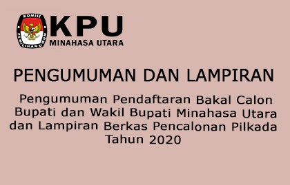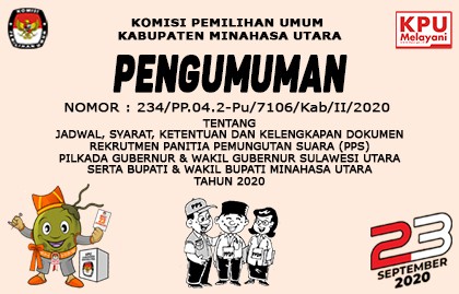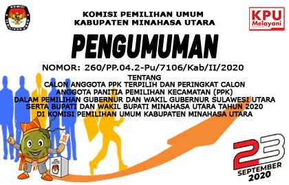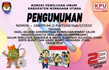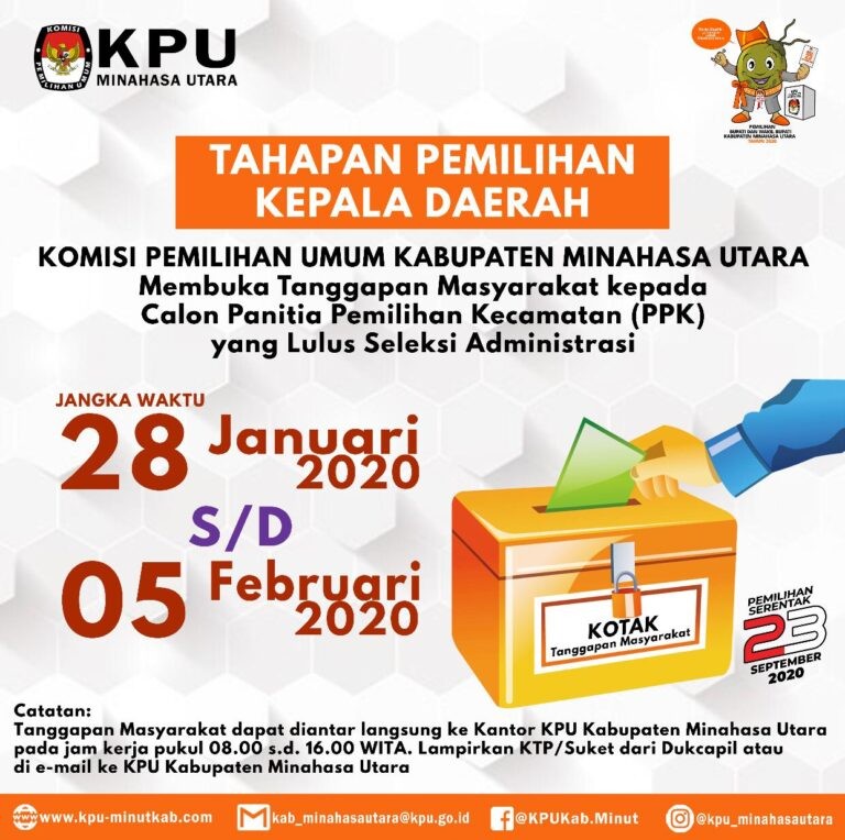 Komisi Pemilihan Umum Kabupaten Minahasa Utara dalam pelaksanaan tahapan pembentukan Panitia Pemilihan Kecamatan (PPK) Pemilihan Gubernur dan Wakil Gubernur Sulawesi Utara serta Bupati dan Wakil Bupati Minahasa Utara Tahun 2020, setelah melaksanakan SELEKSI WAWANCARA calon anggota PPK, dengan ini MENGUMUMKAN NAMA-NAMA CALON ANGGOTA PPK TERPILIH DAN PERINGKAT CALON ANGGOTA PPK sebagai berikut: KLIK DISINI Sehubungan dengan pengumuman ini, disampaikan hal-hal sebagai berikut: 1. Nama-nama yang pada nomor urut 1 s/d 5 ditetapkan sebagai calon anggota terpilih untuk PPK; 2. KPU Kabupaten Minahasa Utara membuka kesempatan tanggapan masyarakat Tahap II sejak tanggal 15 Februar i – 21 Februar i 2020 3. Tanggapan masyarakat disampaikan seeara tertulis dengan lampiran KTP Elektronik dari anggota masyarak t yang menyampaikan tanggapan; 4 . Tanggapan masyarakat disampaikan melalui Kotak Tanggapan Masyarakat di Kantor KPU Kabupaten Minahasa Utara atau melalui email kabminahasautara@kpu.go.id paling lambat tanggal 21 Februari 2020 Pukul 23.59 WITA. Untuk informasi lebih lanjut dapat menghubungi Pokja Pembentukan PPK KP U Kabupaten Minahasa Utara Telp: 082188089955 contact person: Henny A. Sengkey SP, M.Si.