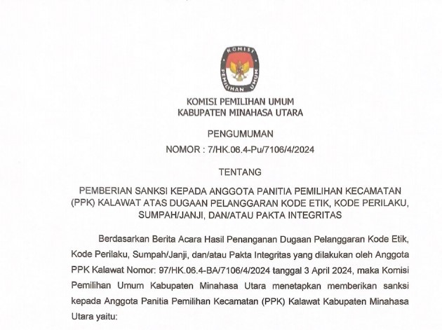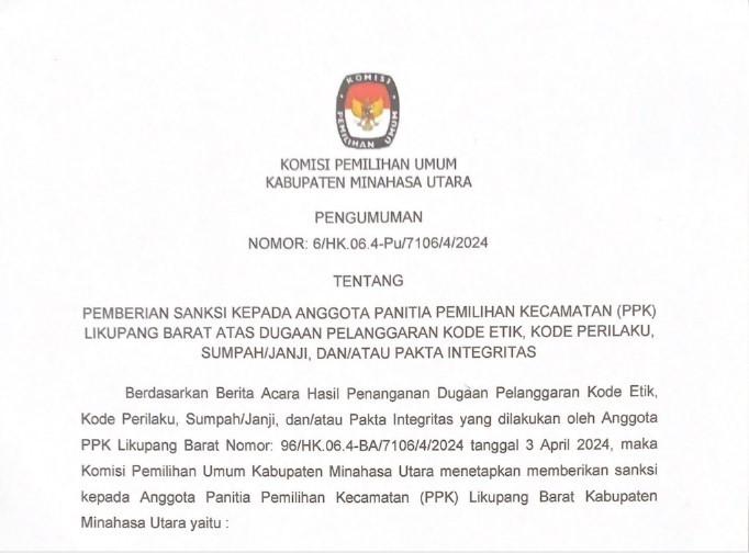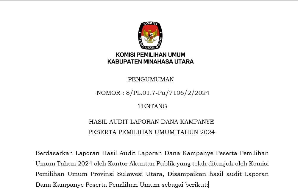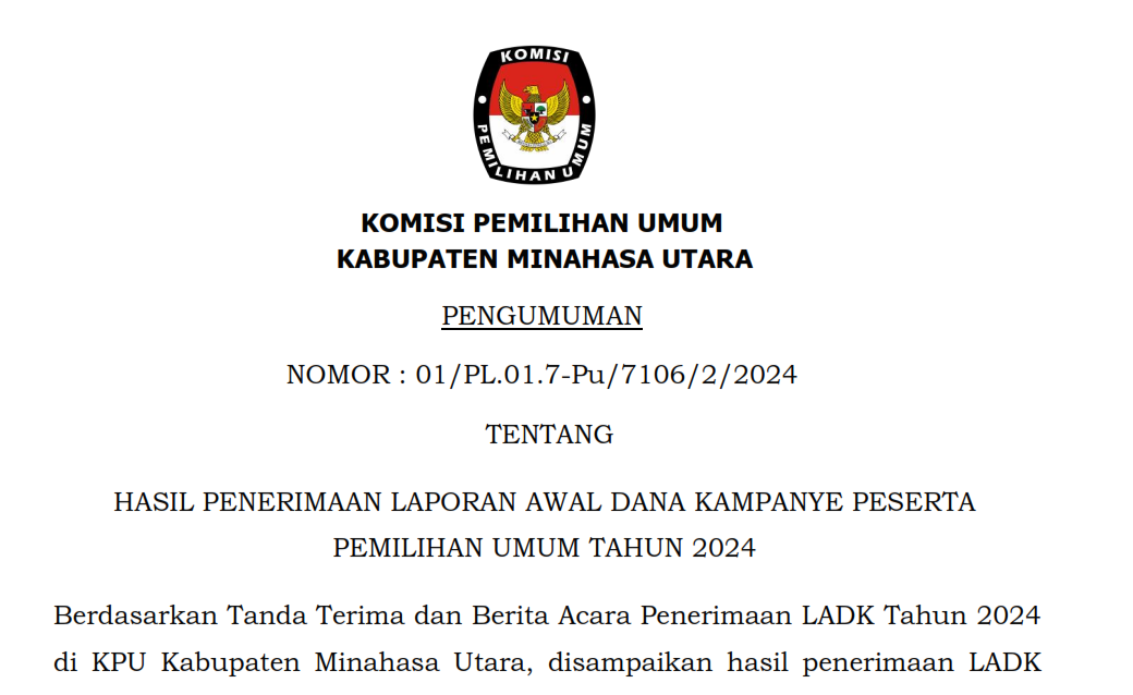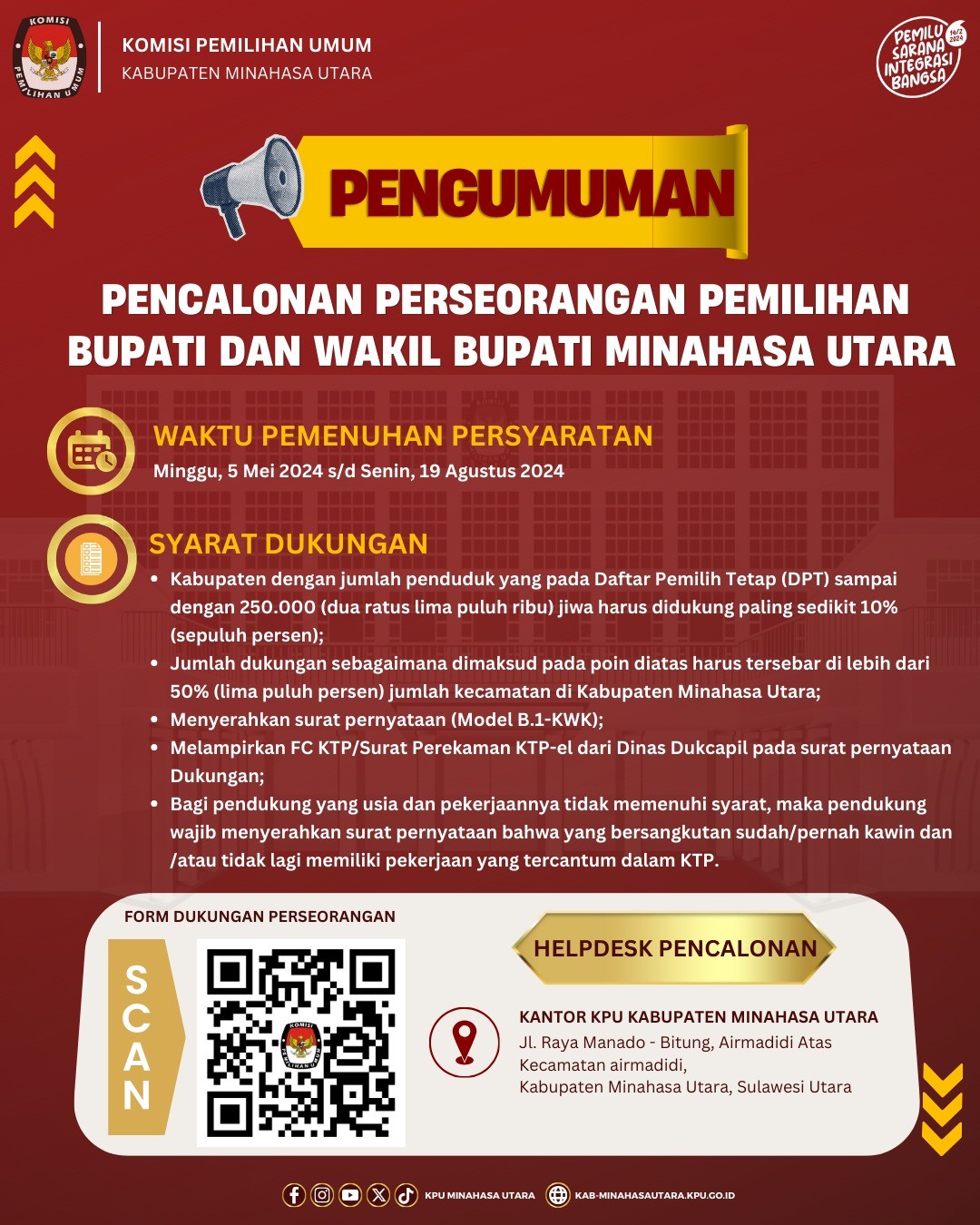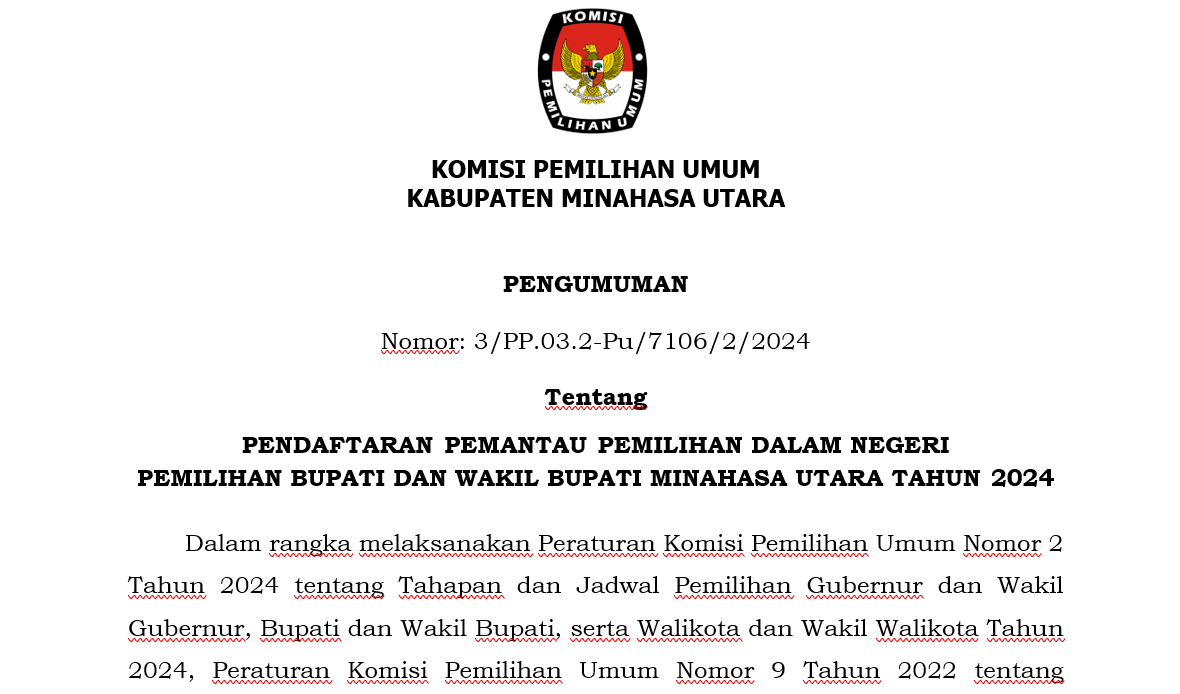Dalam rangka melaksanakan Peraturan Komisi Pemilihan Umum Nomor 2 Tahun 2024 tentang Tahapan dan Jadwal Pemilihan Gubernur dan Wakil Gubernur, Bupati dan Wakil Bupati, serta Walikota dan Wakil Walikota Tahun 2024, Peraturan Komisi Pemilihan Umum Nomor 9 Tahun 2022 tentang Partisipasi Masyarakat Dalam Pemilihan Umum dan Pemilihan Gubernur dan Wakil Gubernur, Bupati dan Wakil Bupati, dan/atau Walikota dan Wakil Walikota, Keputusan Komisi Pemilihan Umum Kabupaten Minahasa Utara Nomor: 465 Tahun 2024 tentang Pedoman Teknis Pelaksaan Tahapan, Program dan Jadwal Penyelenggaraan Pemilihan Bupati dan Wakil Bupati Kabupaten Minahasa Utara Tahun 2024 serta Keputusan Komisi Pemilihan Umum Kabupaten Minahasa Utara Nomor: 466 Tahun 2024 tentang Pedoman Teknis Pendaftaran Pemantau Dan Pemantauan Pemilihan Bupati dan Wakil Bupati Kabupaten Minahasa Utara Tahun 2024, maka Komisi Pemilihan Umum Kabupaten Minahasa Utara mengumumkan Pendaftaran Pemantau Pemilihan Dalam Negeri Pemilihan Bupati dan Wakil Bupati Kabupaten Minahasa Utara Tahun 202.