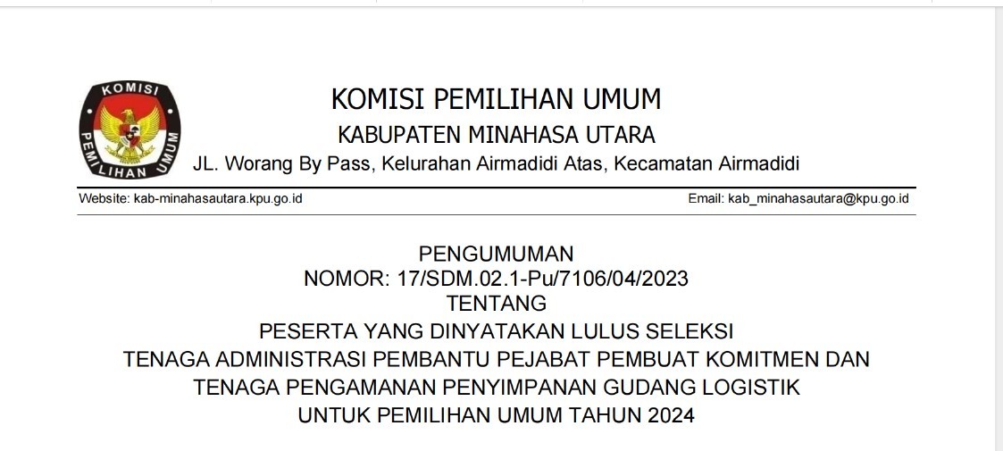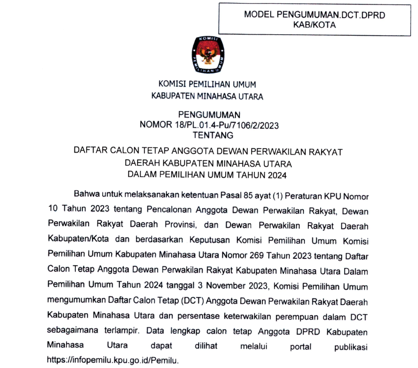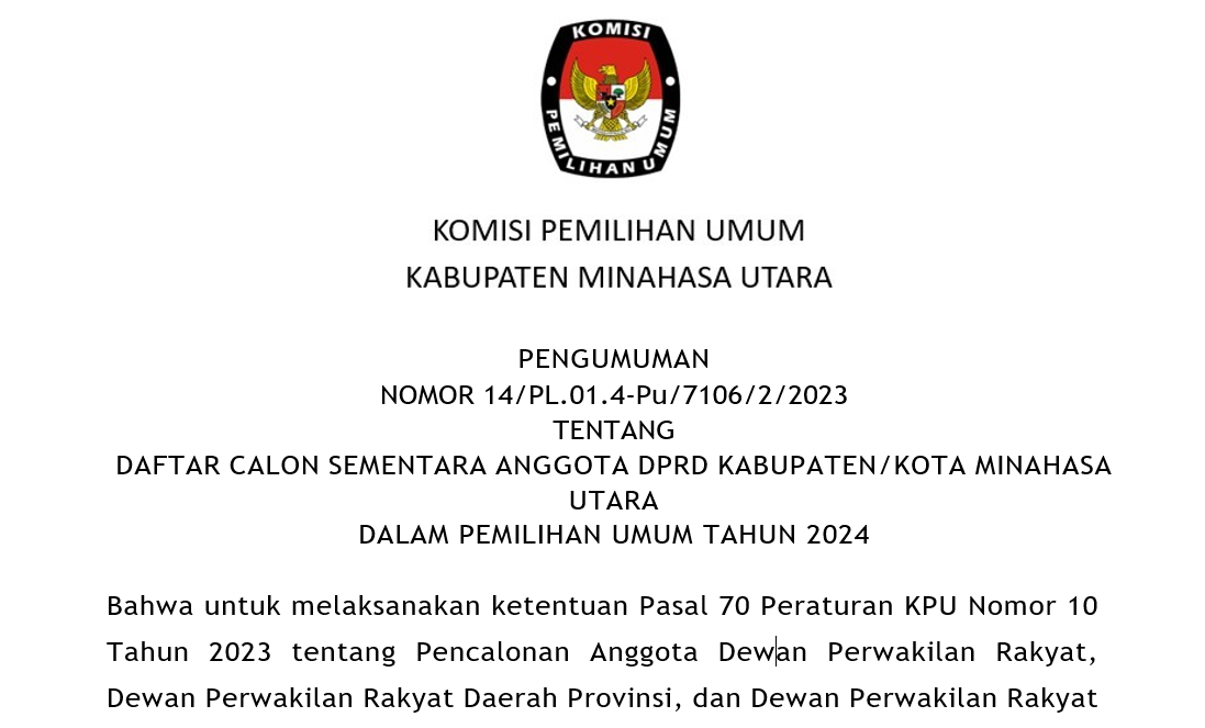 Bahwa untuk melaksanakan ketentuan Pasal 70 Peraturan KPU Nomor 10 Tahun 2023 tentang Pencalonan Anggota Dewan Perwakilan Rakyat, Dewan Perwakilan Rakyat Daerah Provinsi, dan Dewan Perwakilan Rakyat Daerah Kabupaten/Kota, KPU Kabupaten Minahasa Utara mengumumkan Daftar Calon Sementara (DCS) Anggota DPRD Kabupaten Minahasa Utara (KLIK DISINI) dan Persentase Keterwakilan Perempuan dalam Daftar Calon Sementara (DCS) (KLIK DISINI).